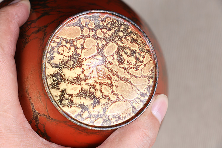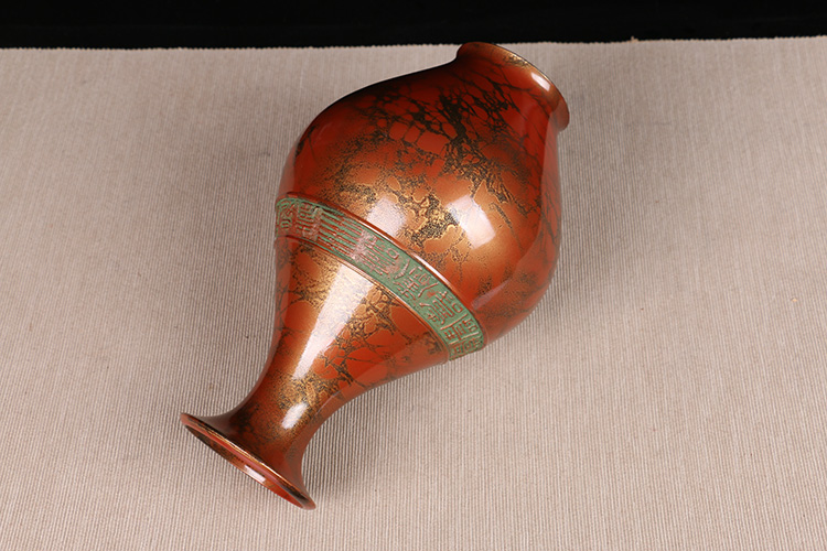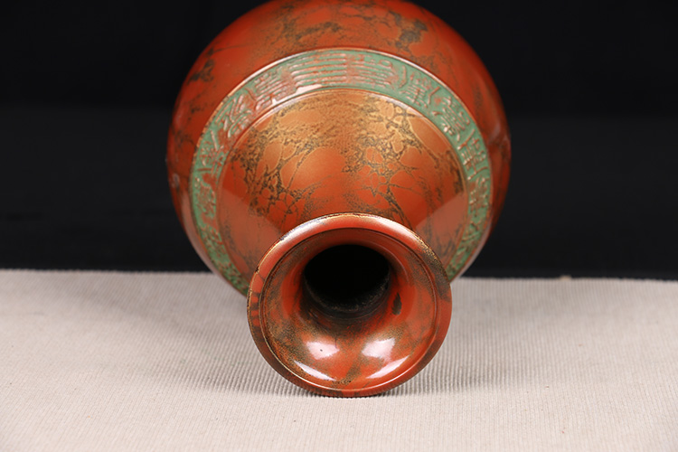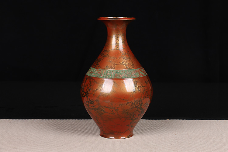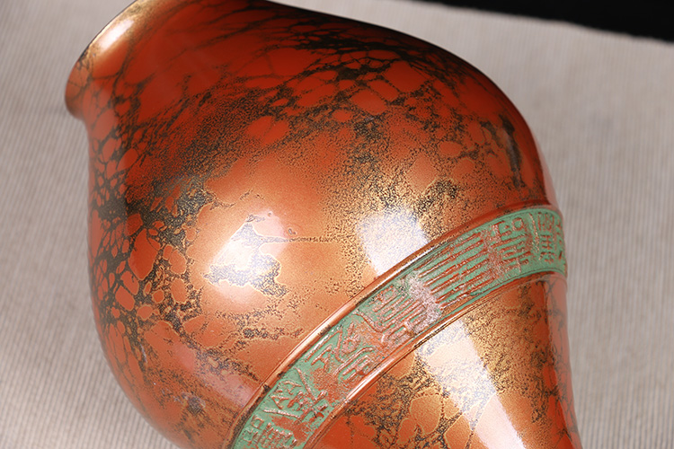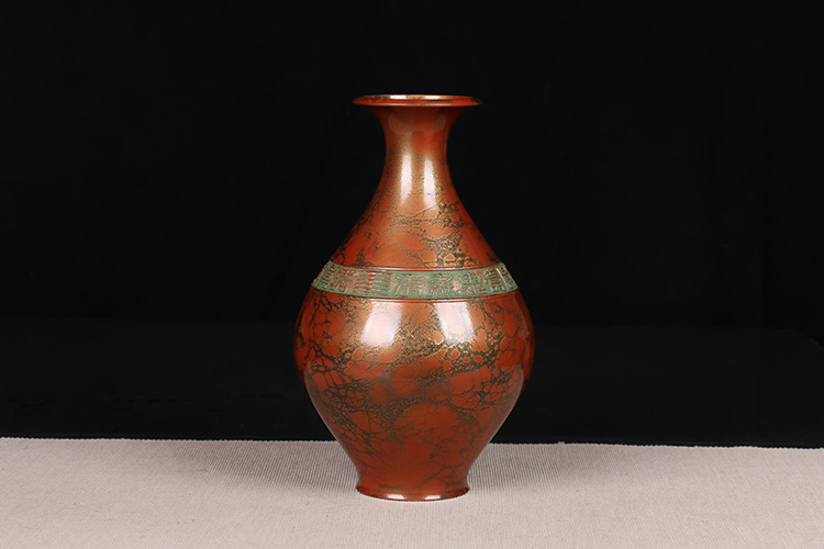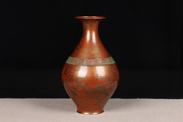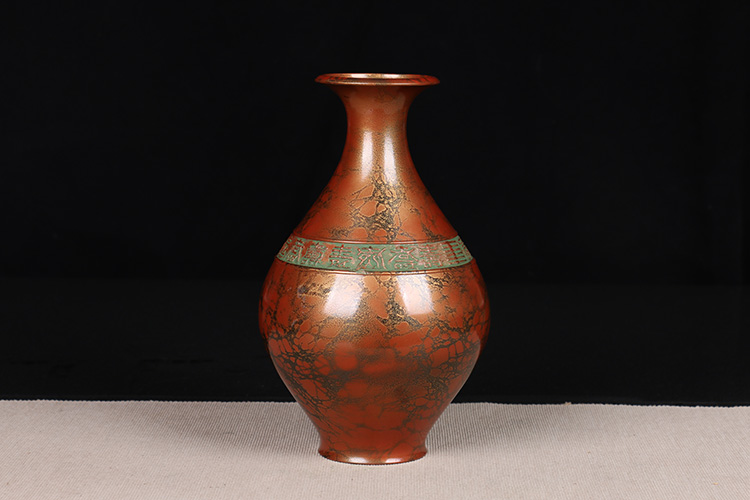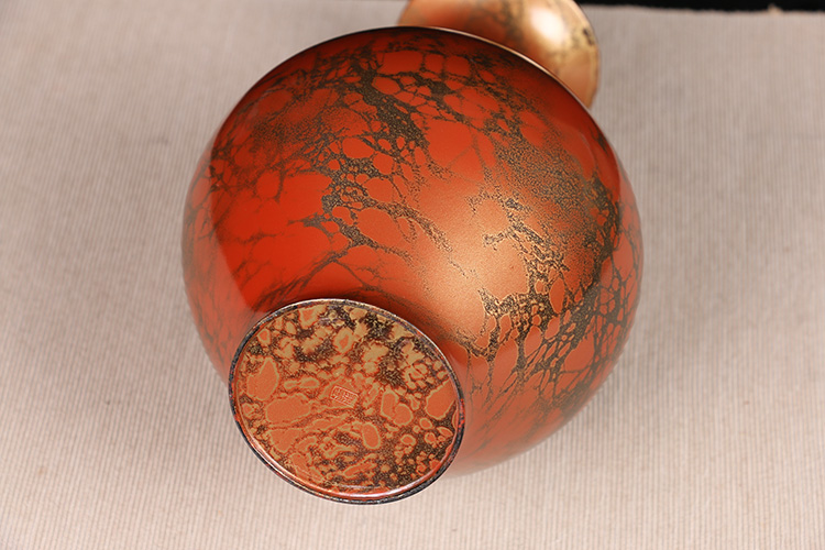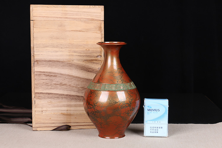 日本花器 日本铸铜橙斑双锤头型铜花瓶 日本铸铜工艺,橙斑着色,带作者款识,带原装供箱