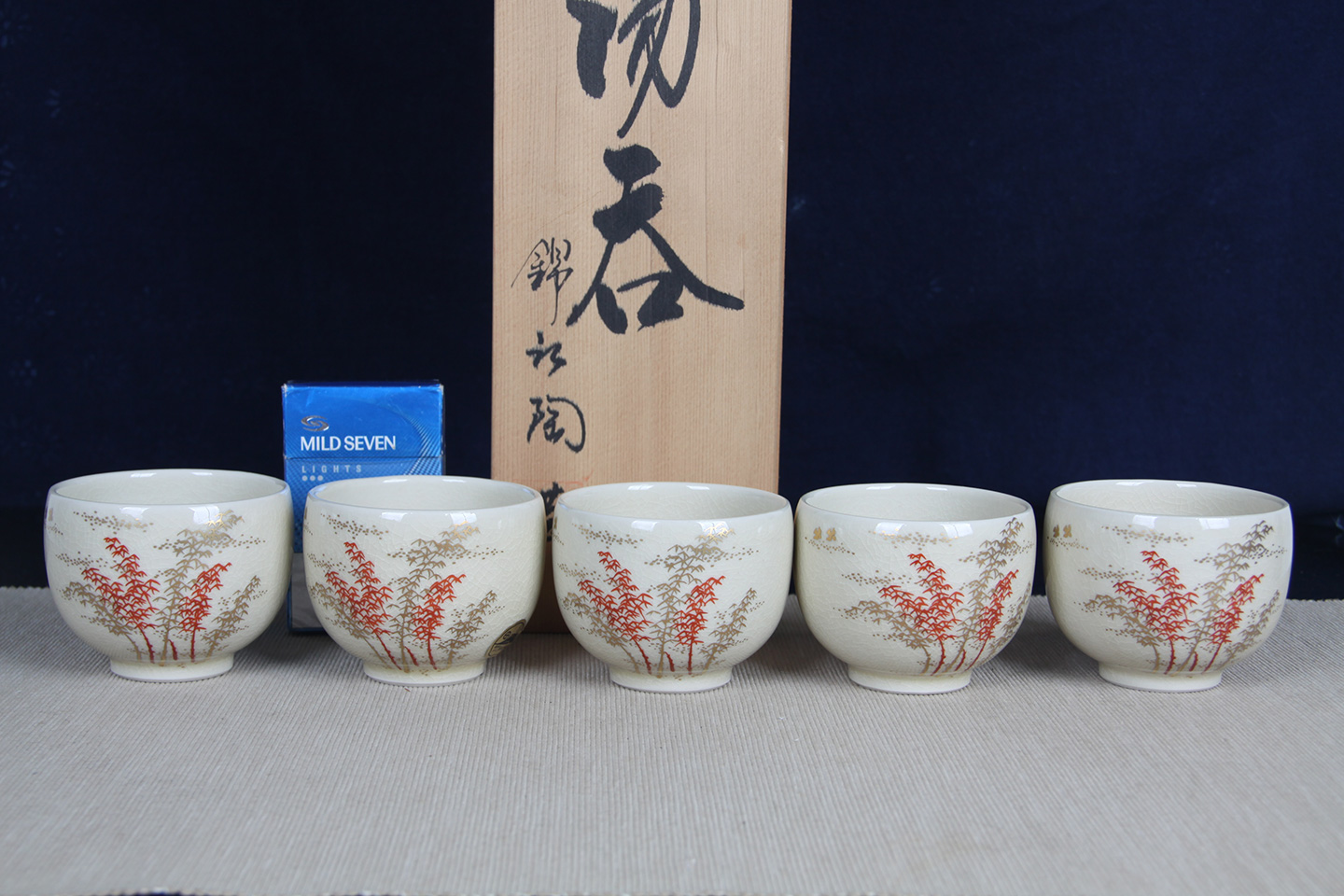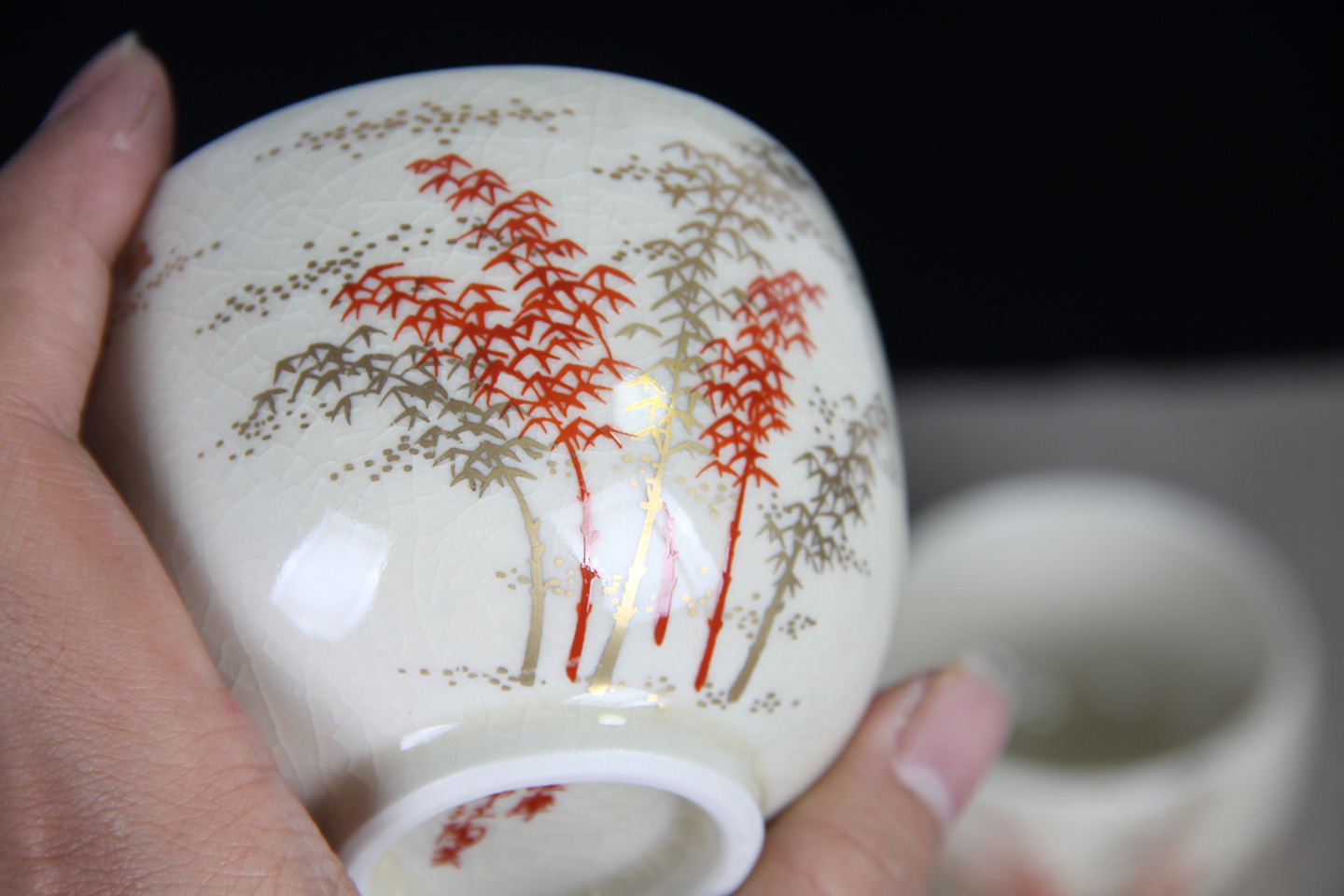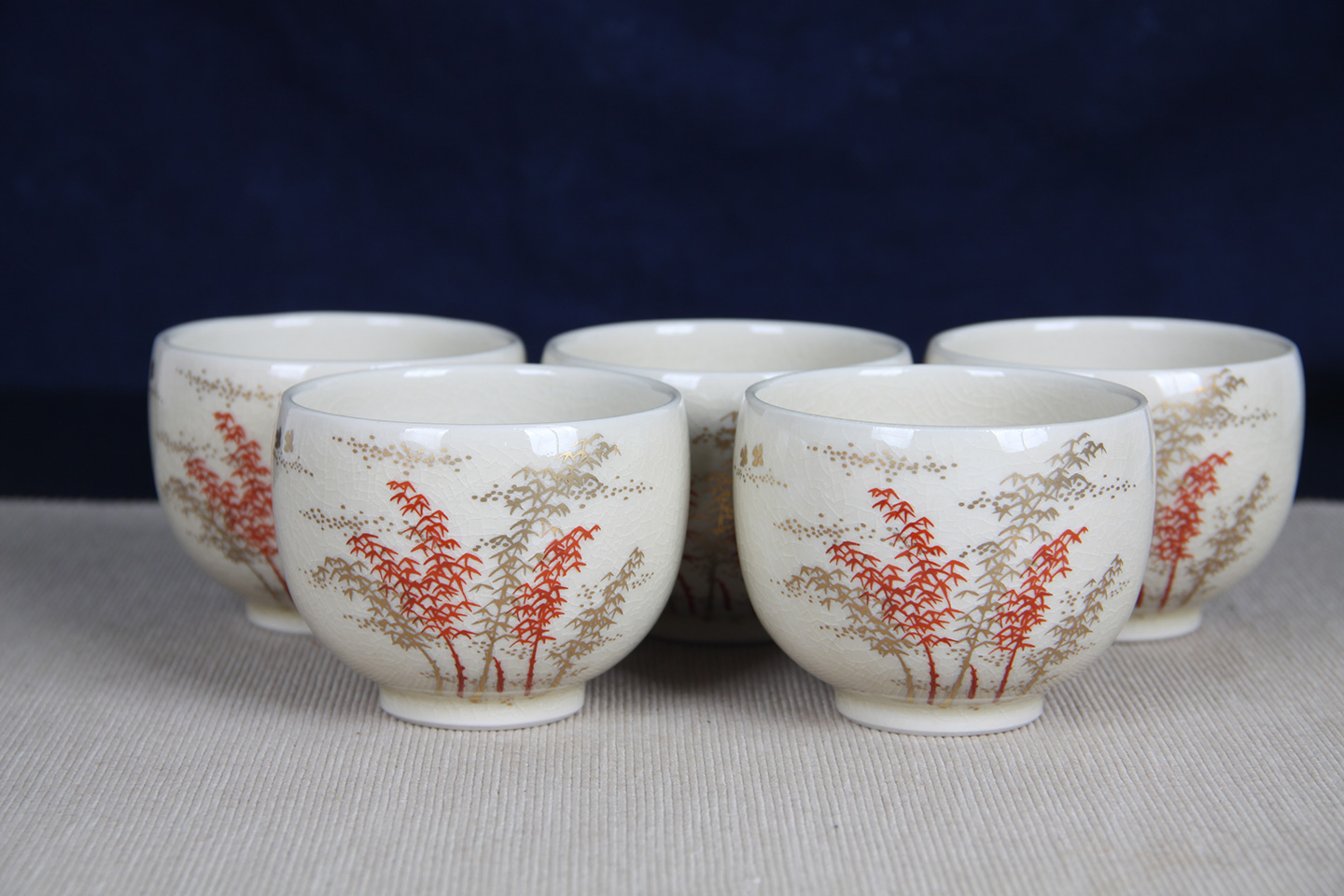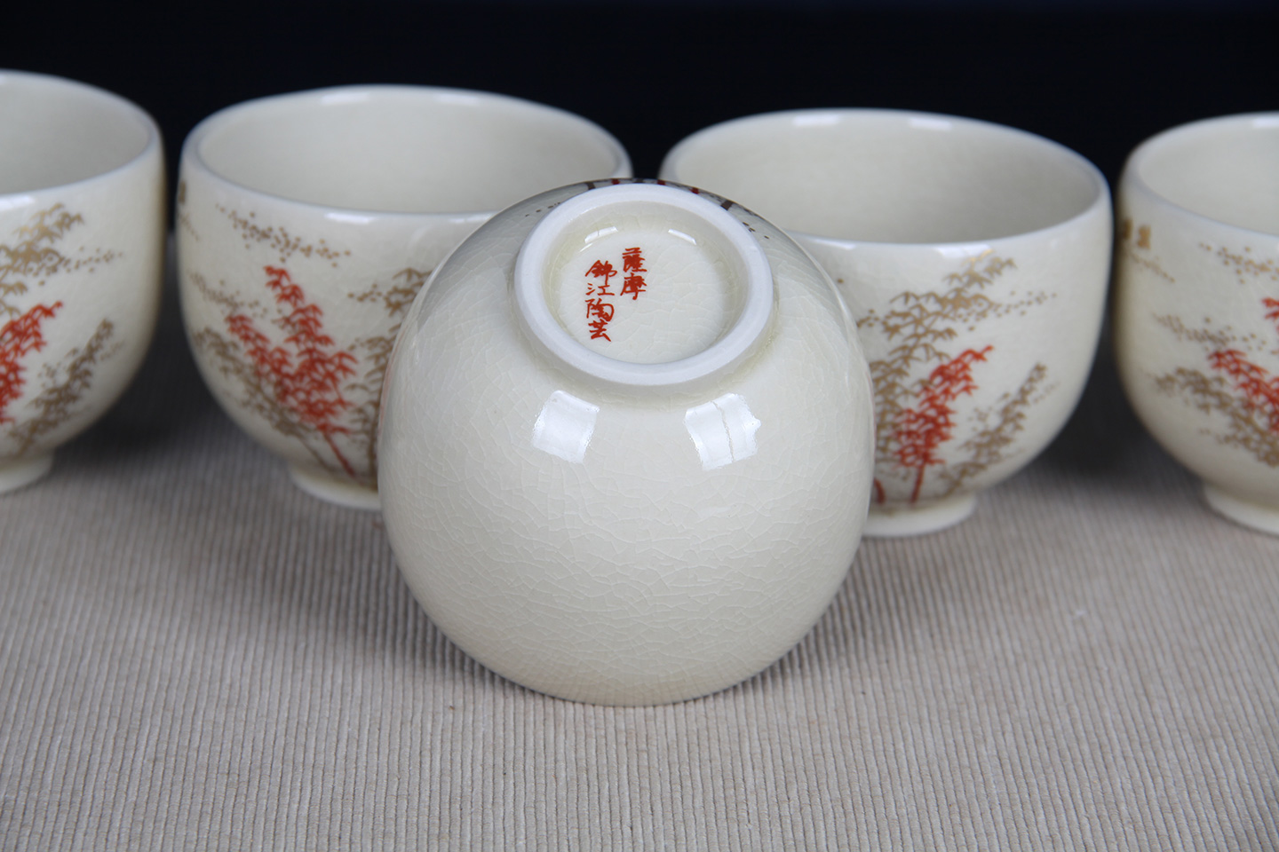 日本陶瓷 萨摩烧竹叶纹品茶杯五客 经典日本萨摩烧,细腻开片,绘制竹叶纹,带原装供箱