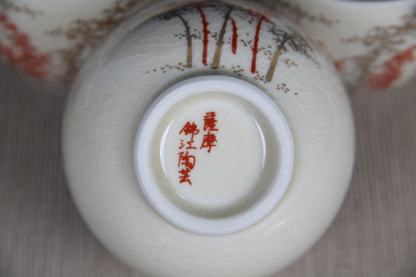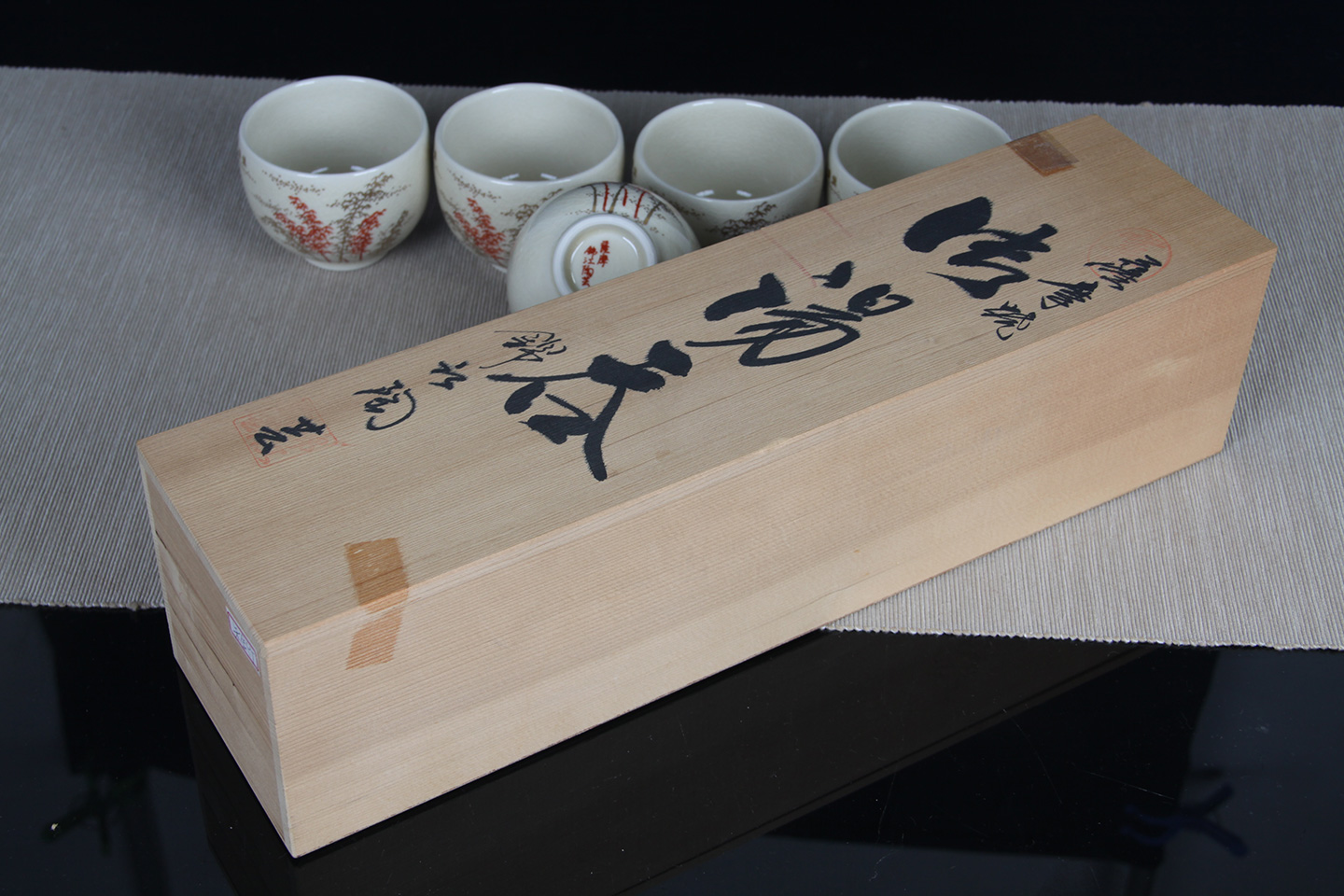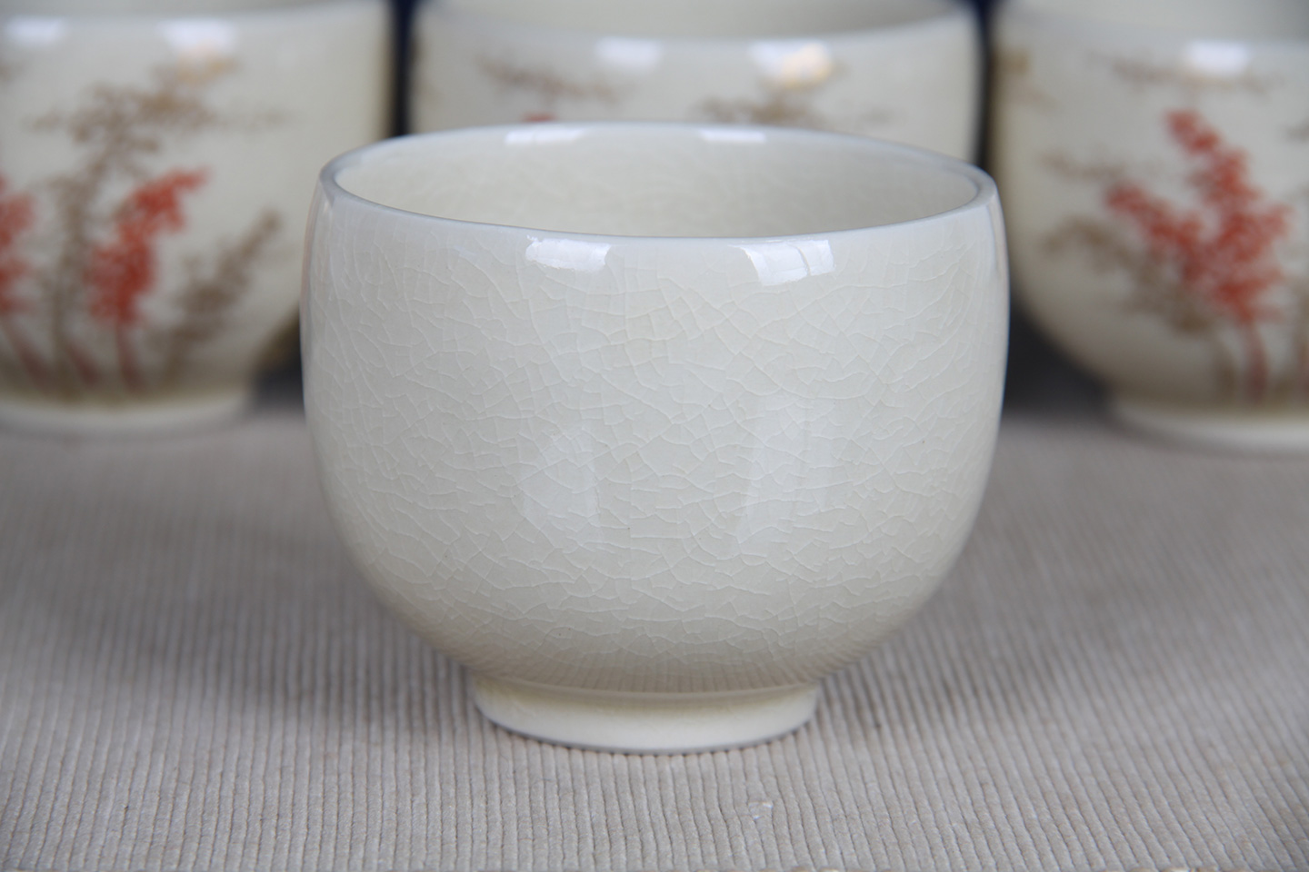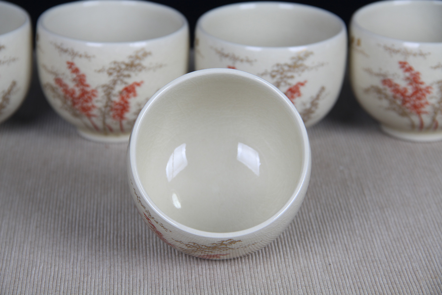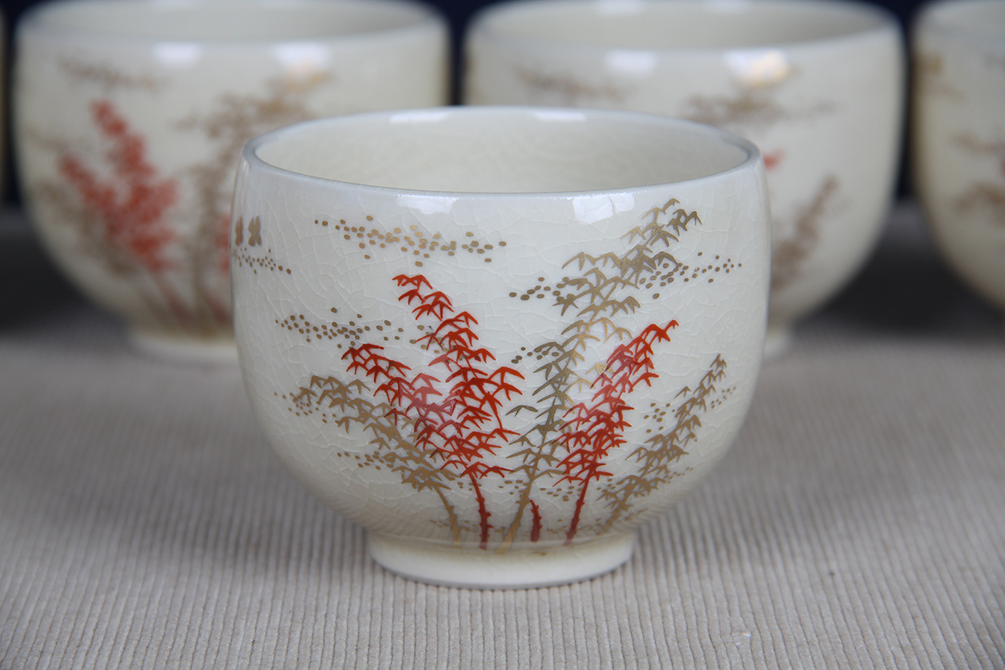 日本陶瓷 萨摩烧竹叶纹品茶杯五客 经典日本萨摩烧,细腻开片,绘制竹叶纹,带原装供箱