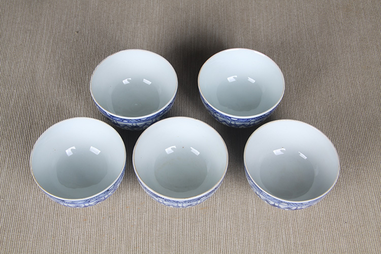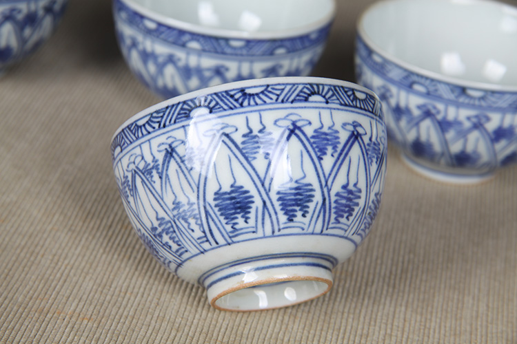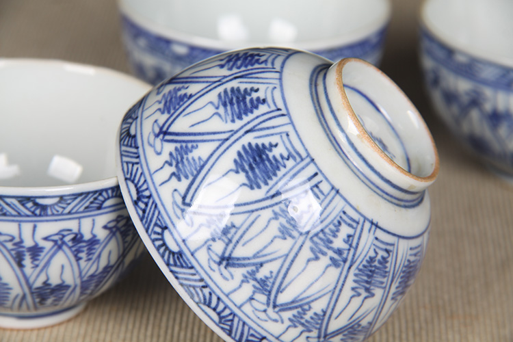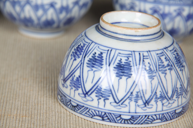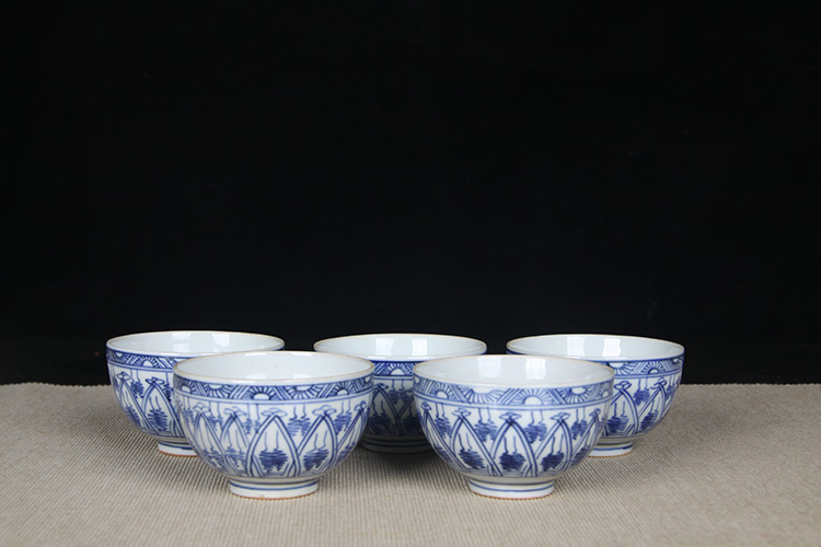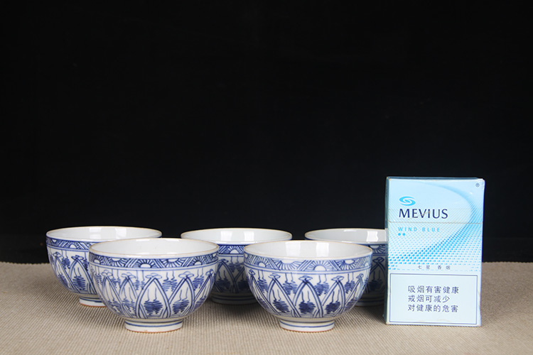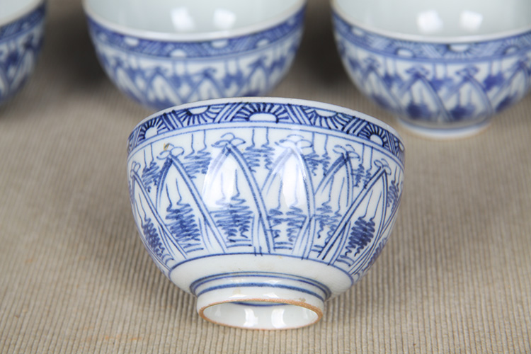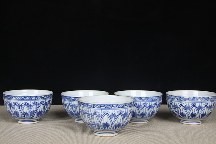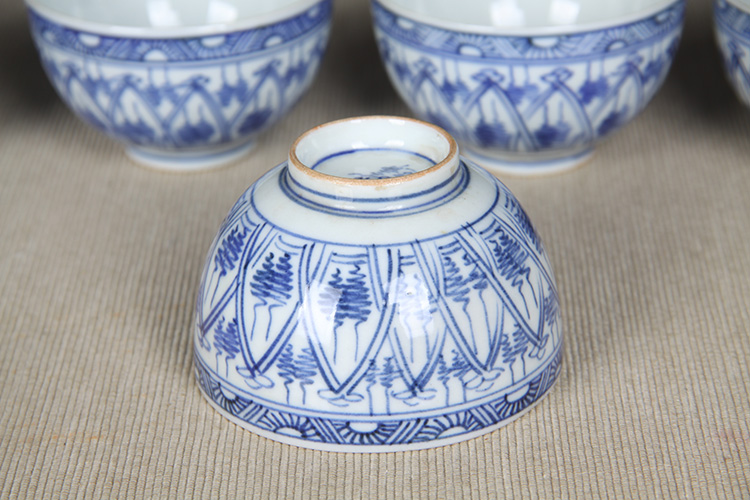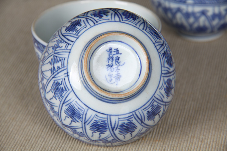 日本品茶杯 日本青花图案纹品茶杯五客 传统鸡心杯器型,绘制图案纹,明代发色,沉稳。日本名家五良大甫吴祥瑞造,包浆老,有年份的老杯
