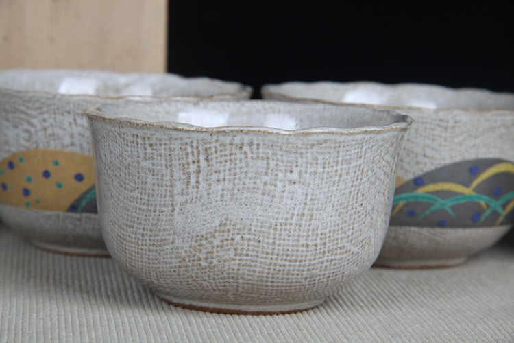日本茶杯组 日本布纹底图案纹品茶杯五客 日本灰釉布纹底,釉水肥润,绘制图案纹,描金工艺