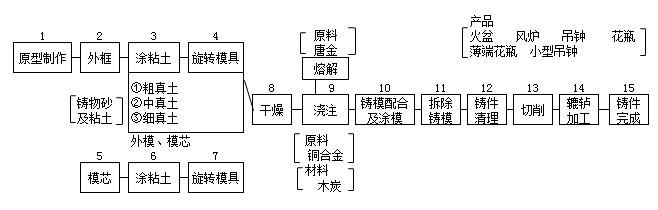 首先用粘土或木头制作出产品形状,称为原型制作,再从原型上翻制产品形状,制作模框。在原型上涂抹含有纸纤维的细腻“纸土”,然后在它的上面涂抹含有“稻草”的粗土,最后用钢筋加固再用粗土包住。从模框中取出原型,在其外模上涂抹一层均匀的薄泥土,之后在内侧填入砂子,如将涂抹的一层薄泥土除去的话,可以完成比金属厚度小一层的东西,这个模芯称之为“中子”。外模中放入模芯“中子”的铸模,将整个铸模焙烧到960℃左右,铜像铸模焙烧时间是12~16小时,摆设物铸模的焙烧时间是6~8小时。铸模焙烧到规定的时间后,再等铸模空冷到约400℃左右的时候,将熔金(铜70~75%,铅5~10%,锌20%)浇注到铸模中,此时,完成铸造。因为铸模是烧制的,故也称为烧模,熔金温度是1100℃~1200℃。这种铸造法是一品制作,与蜡模铸造法相比,可以制作大型的作品。不过,铸模的分割方法、制作方法、组装方法等都需要有熟练的高技术。