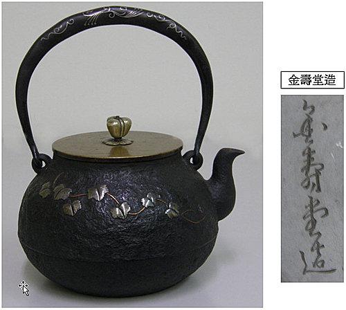 京都鐵器的另一個專長是鑲嵌技術,從1876年開始,原從事刀劍裝飾工作者轉戰鐵壺鑲嵌,其代表堂號為金壽堂,創始人雨宮祖七擅長於壺身或蓋子、壺把上做金、銀、銅三種不同金屬材質的鑲嵌裝飾,在文化文正時期(1868~1887)日本西化開始之時,其作品銷售至歐洲成為私人或博物館的收藏品。此意味著,金壽堂相當早就開始了鐵壺的鑲嵌技術(約江戶時期)。