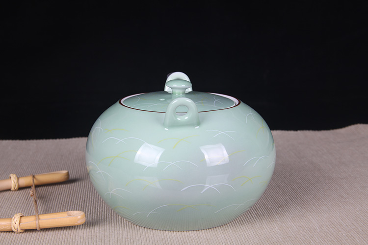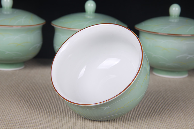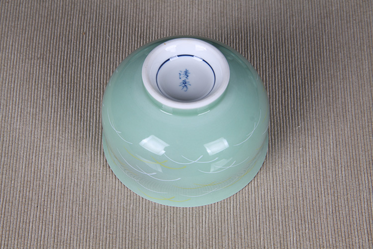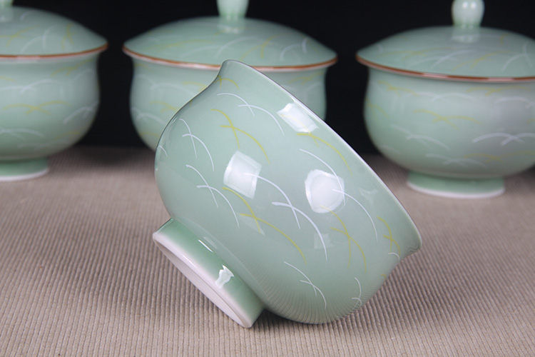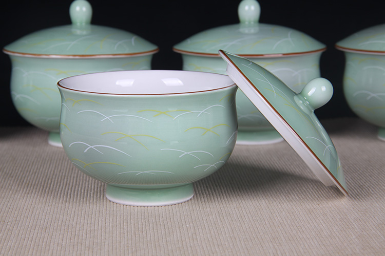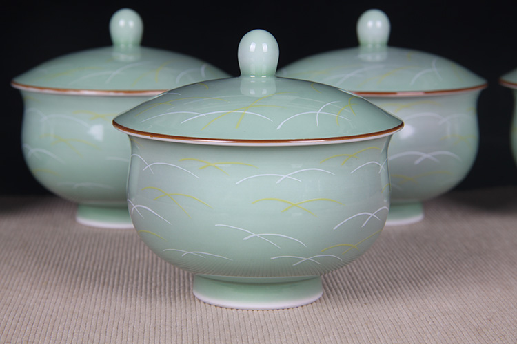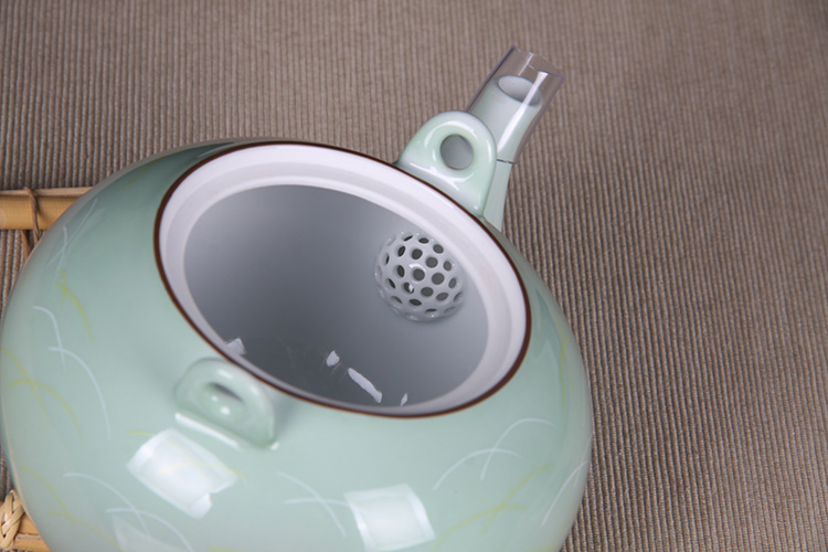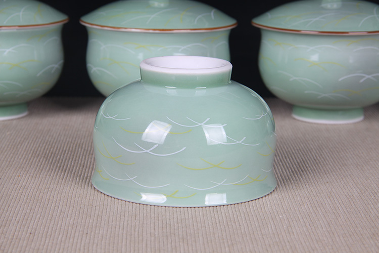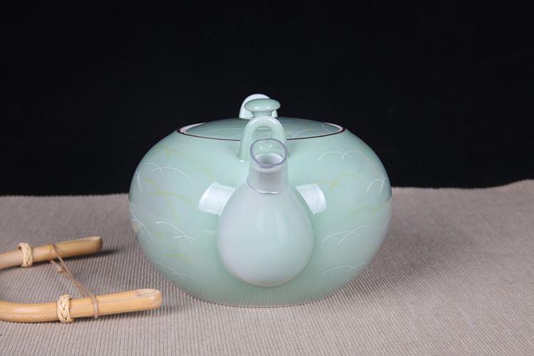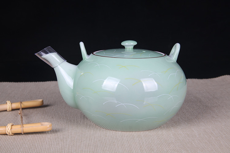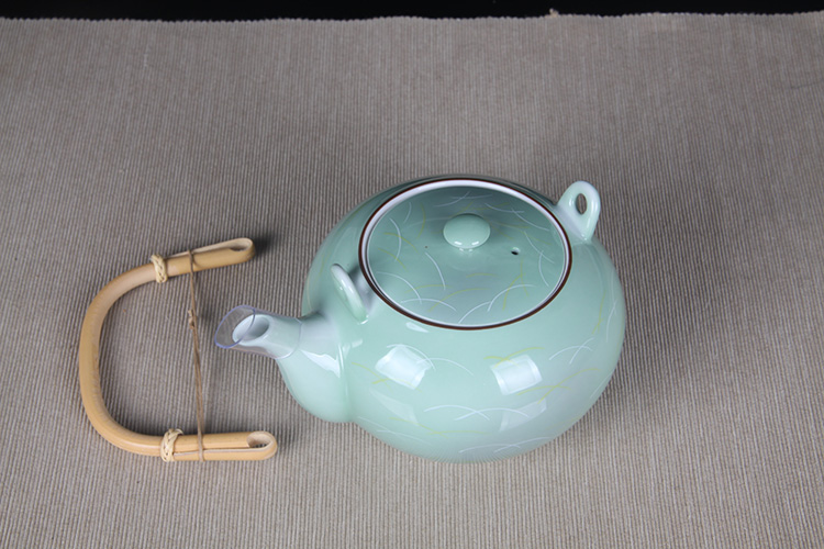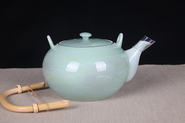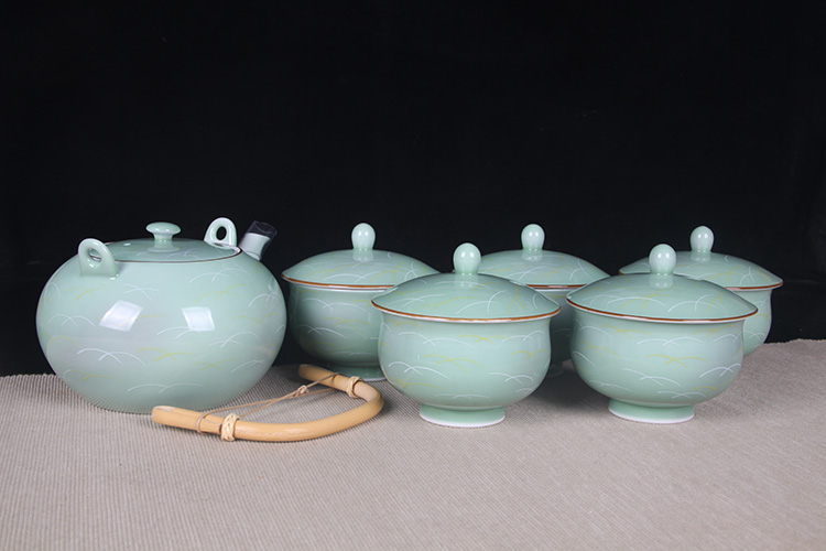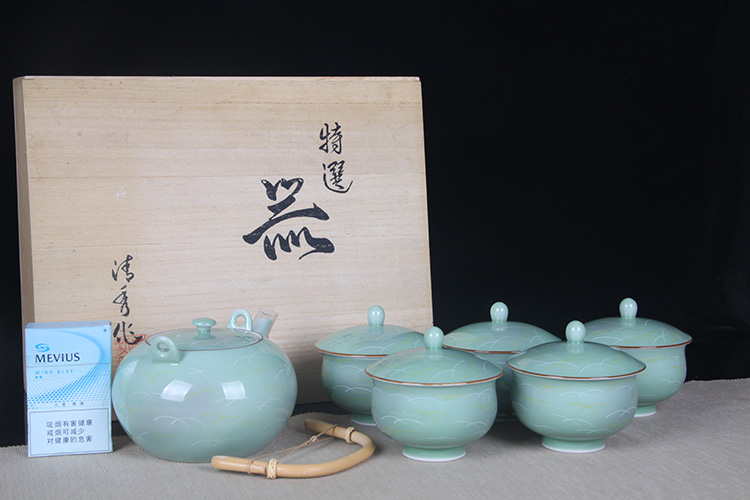 日本陶瓷茶道组 日本青瓷有盖品茶杯提梁壶六件套 日本青瓷工艺,绘制海水纹,釉水肥润,湖水蓝发色,清秀作,泡绿茶十分合适