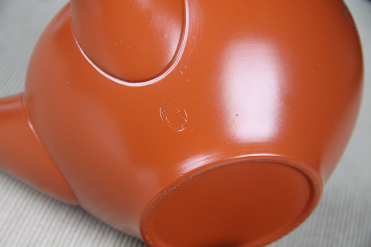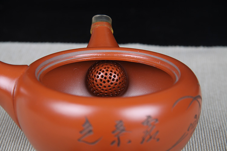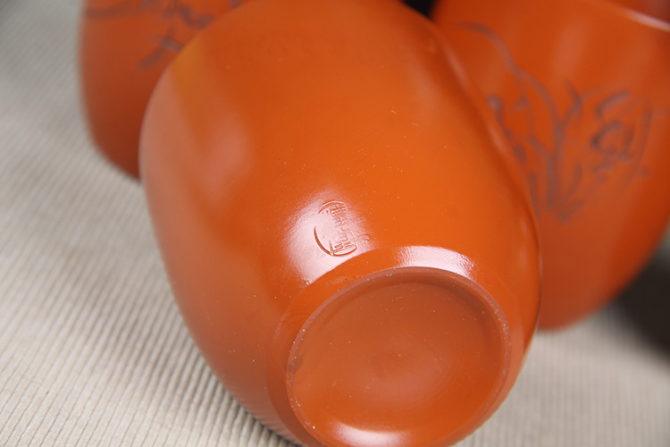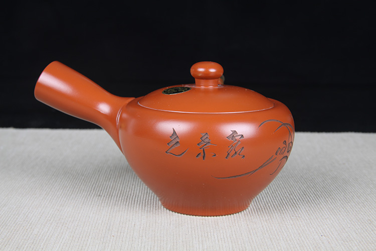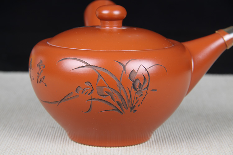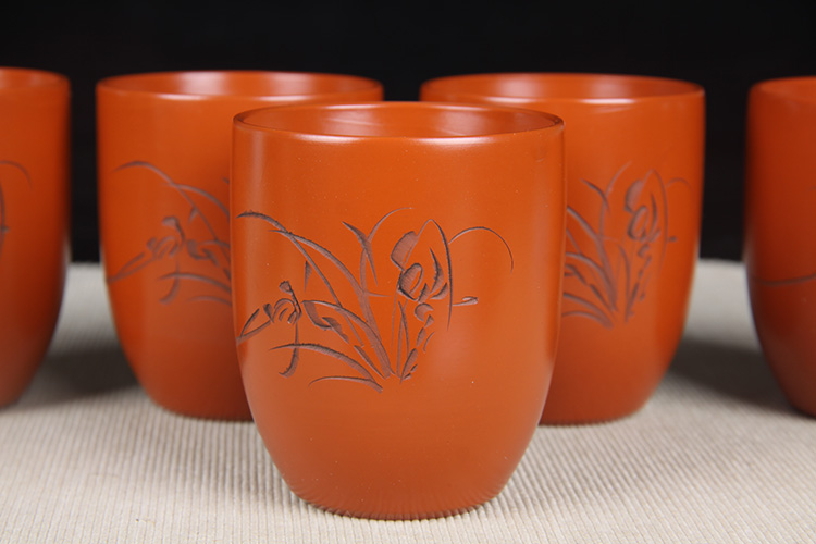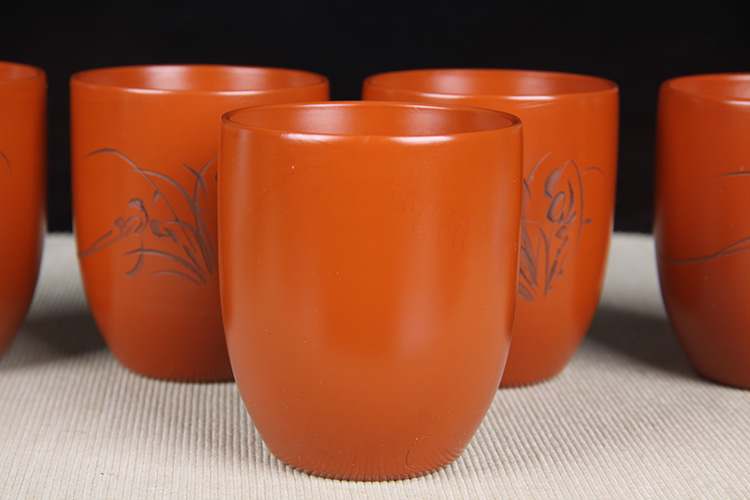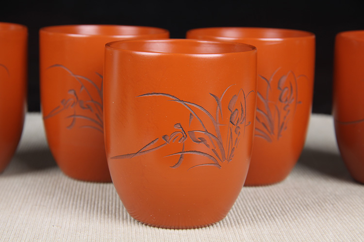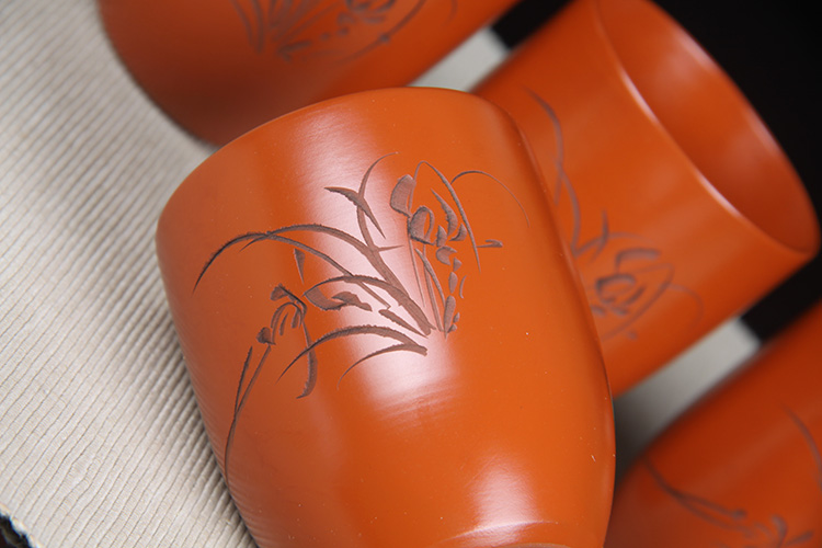日本陶瓷茶道组 日本常滑烧朱泥侧把急须品茶杯六件套 煌堂作,刻绘兰花纹,刻绘精细,全新无使用