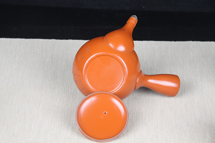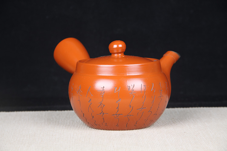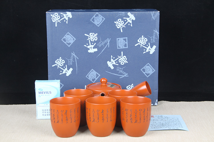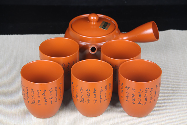 日本陶瓷茶道组 日本常滑烧刻绘诗句侧把壶品茶杯六件套 日本常滑烧工艺,刻绘诗文,高杯高壶,泡绿茶首选,赖凤堂作,带原装供箱。