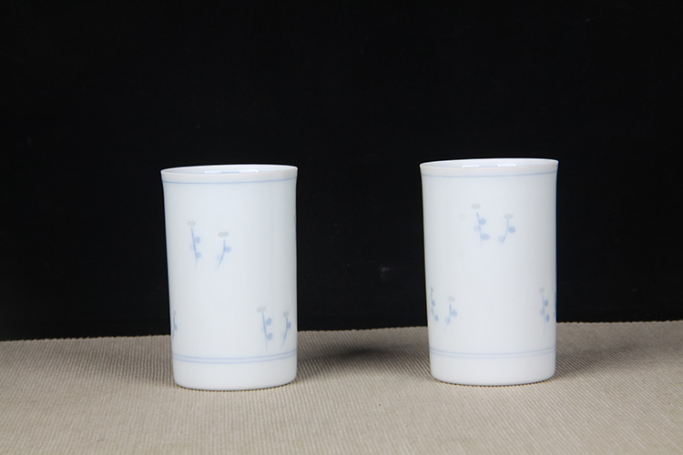 日本陶瓷茶道组 日本青花玲珑瓷花卉纹一壶两杯三件套 玲珑瓷工艺,绘制花卉纹,釉水肥润,四方壶,圆筒杯,顺山作,带原装供箱。
