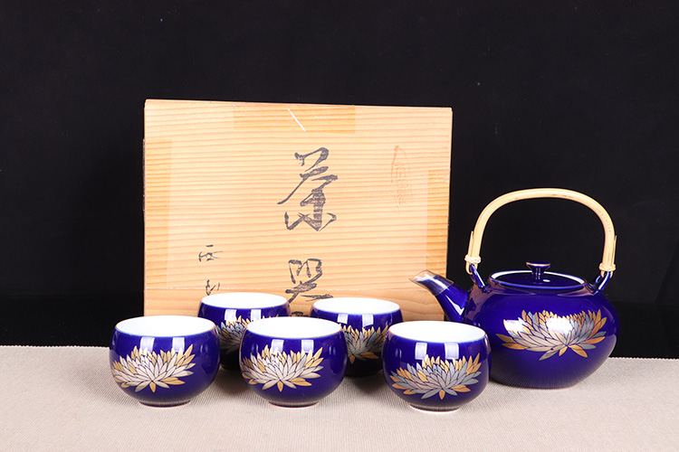 日本陶瓷茶道组 日本竹叶纹提梁壶品茶杯六件套 日本有田烧工艺,绘制竹叶纹,提梁壶,泡绿茶十分合适,品茶杯内外彩工艺,红山款,带原装供箱
