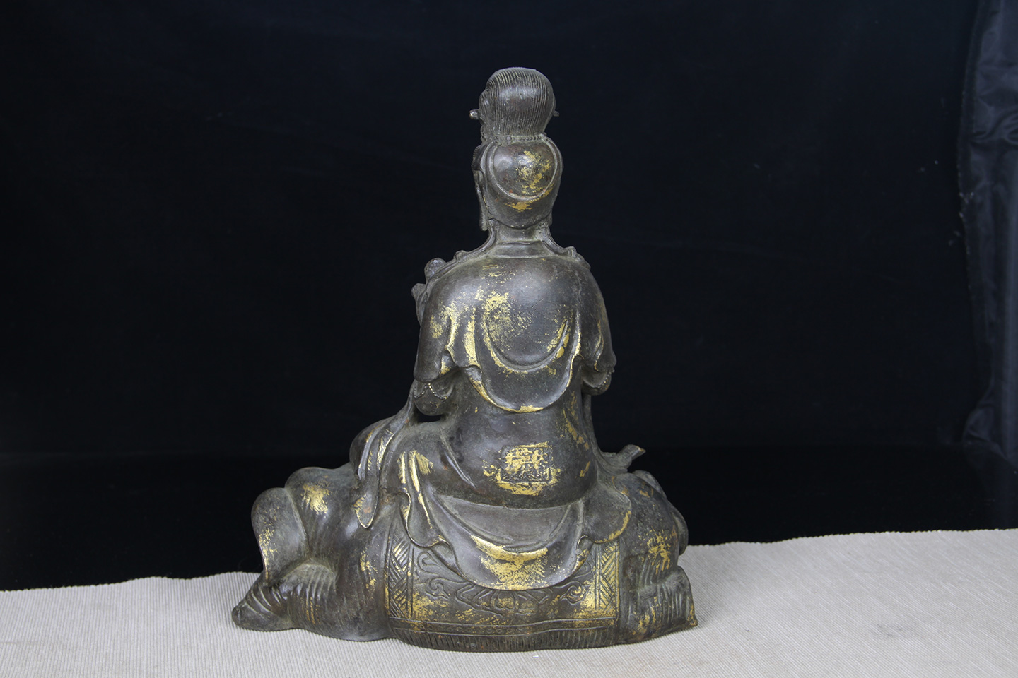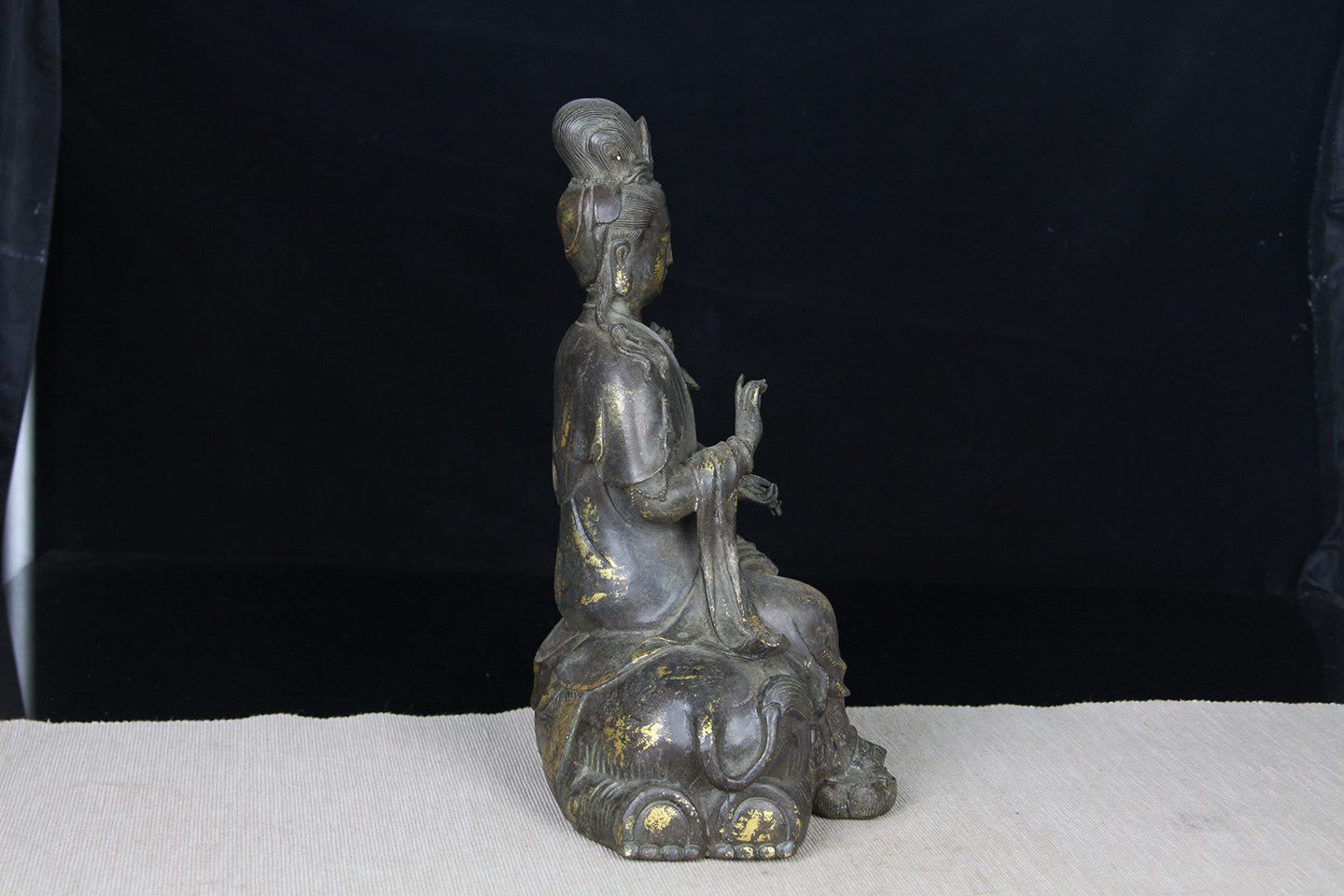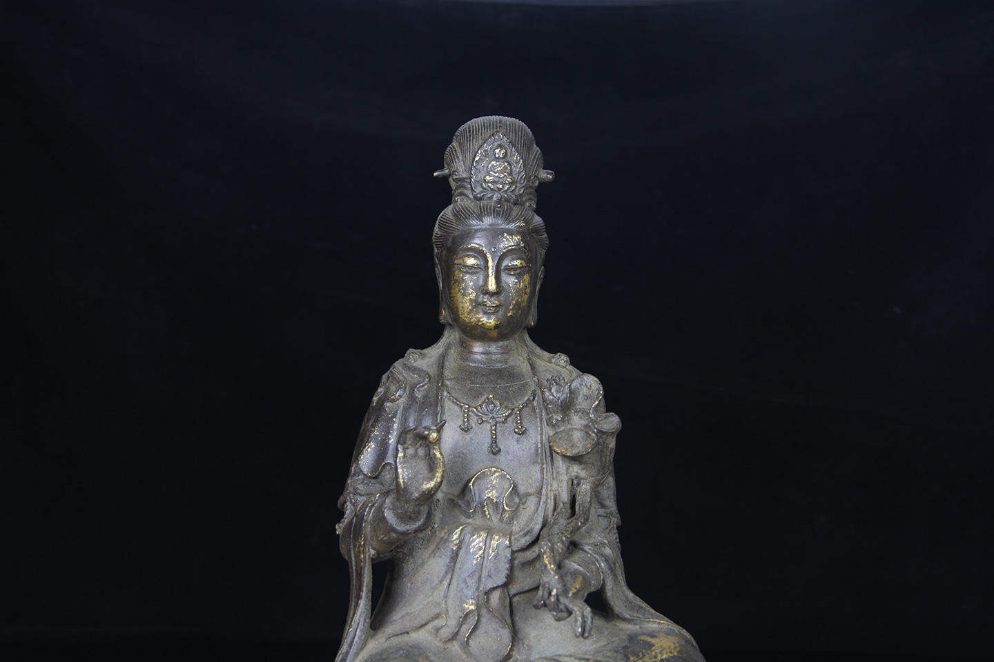 日本佛像 铸铁老菩萨 包浆皮老 左右各一个灵兽狮 观音面慈祥露笑 普度众生
