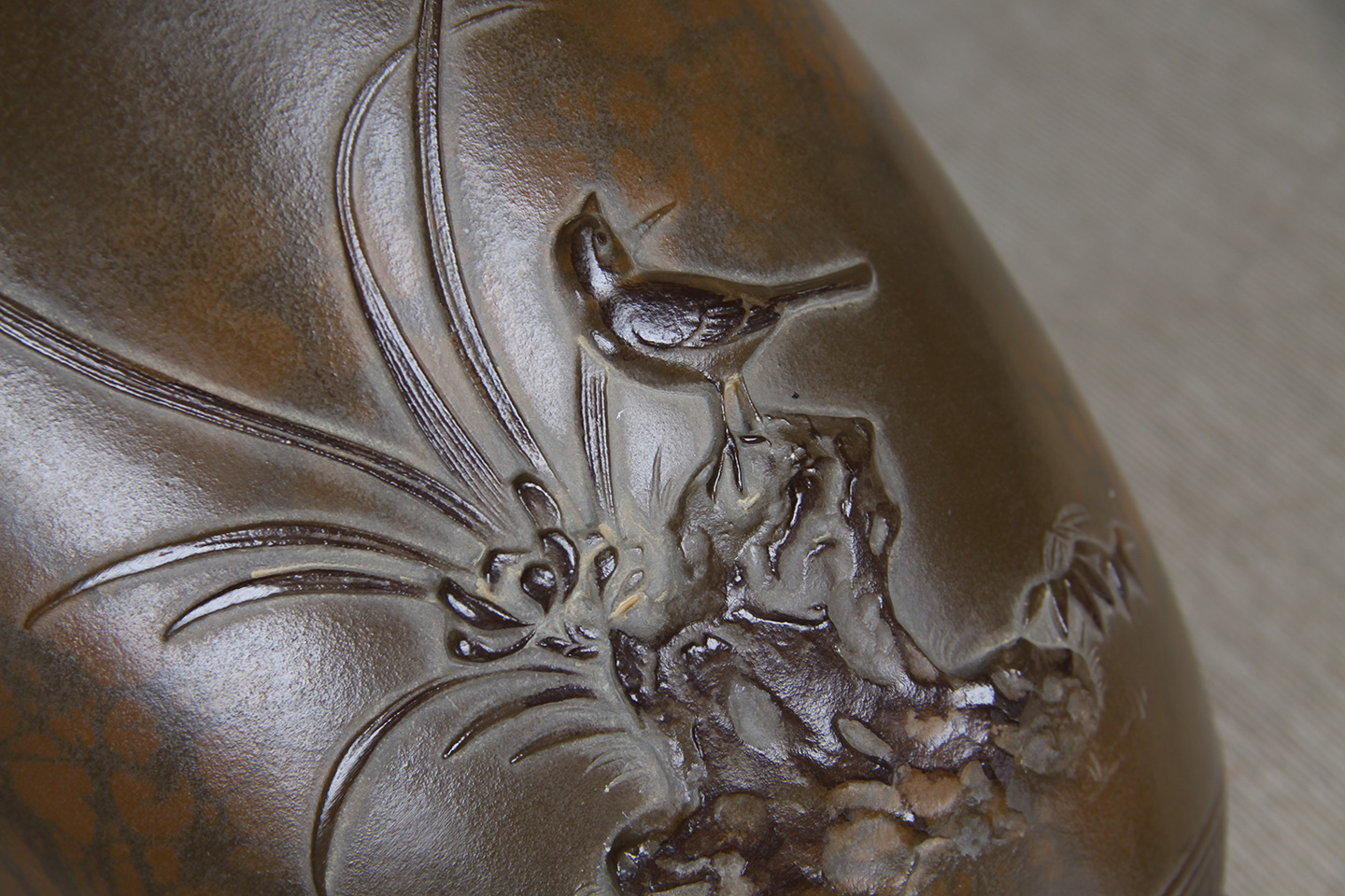 日本花器 日本铸铜橙斑双锤头型铜花瓶 日本铸铜工艺,橙斑着色,带作者款识,带原装供箱