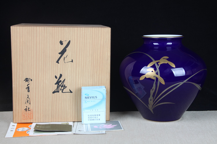 【名称】日本花器 日本香兰社蓝底描金兰花纹大肚花瓶 日本香兰社出品,精工兰花纹蓝底瓷花瓶花入,做工精细,带原装供箱证书。
