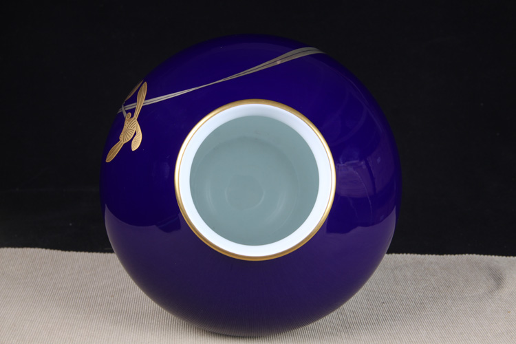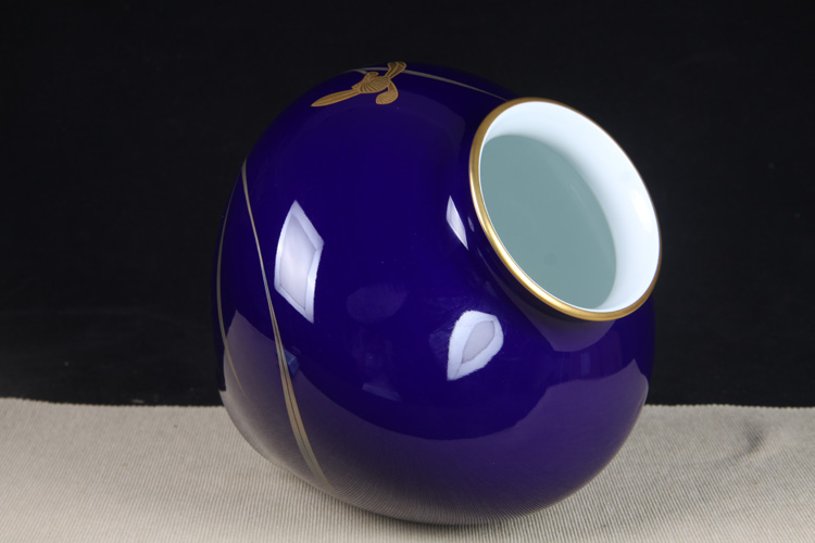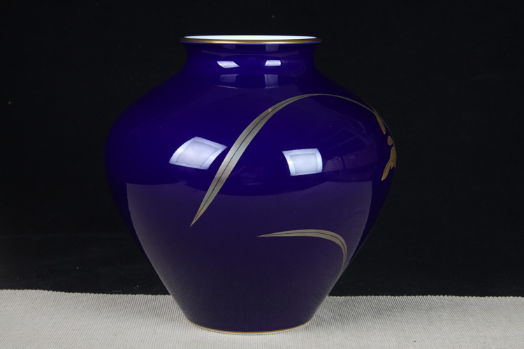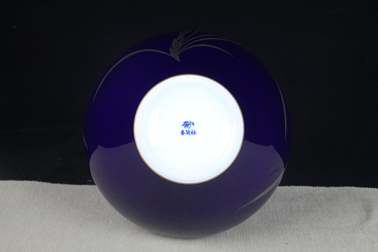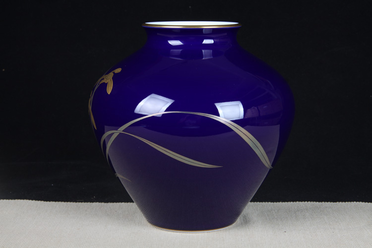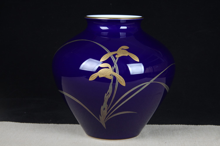 日本花器 日本香兰社蓝底描金兰花纹大肚花瓶 日本香兰社出品,精工兰花纹蓝底瓷花瓶花入,做工精细