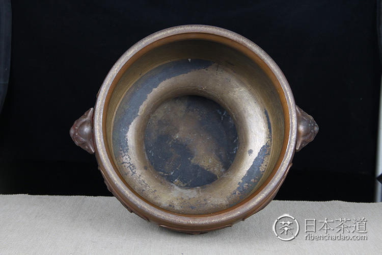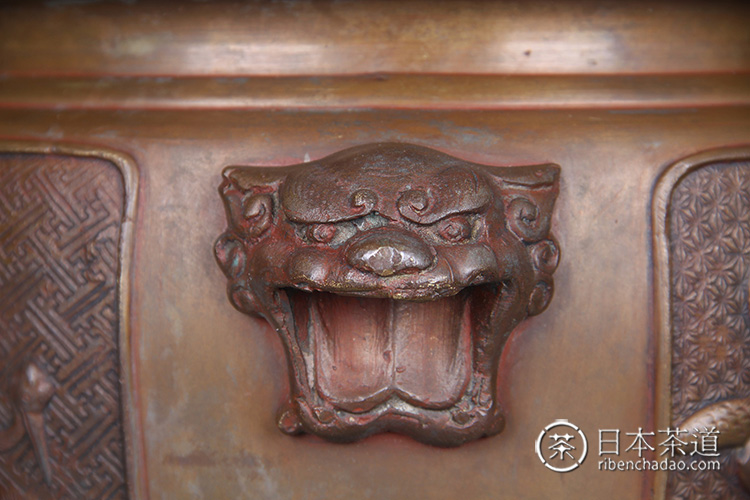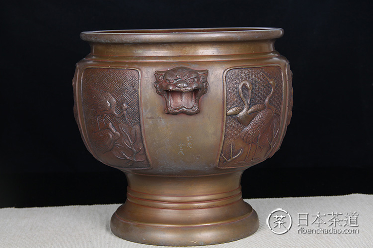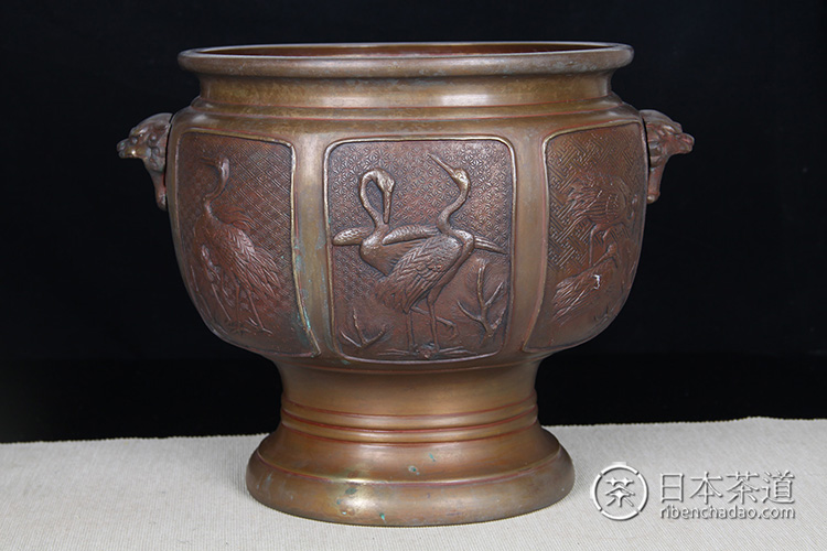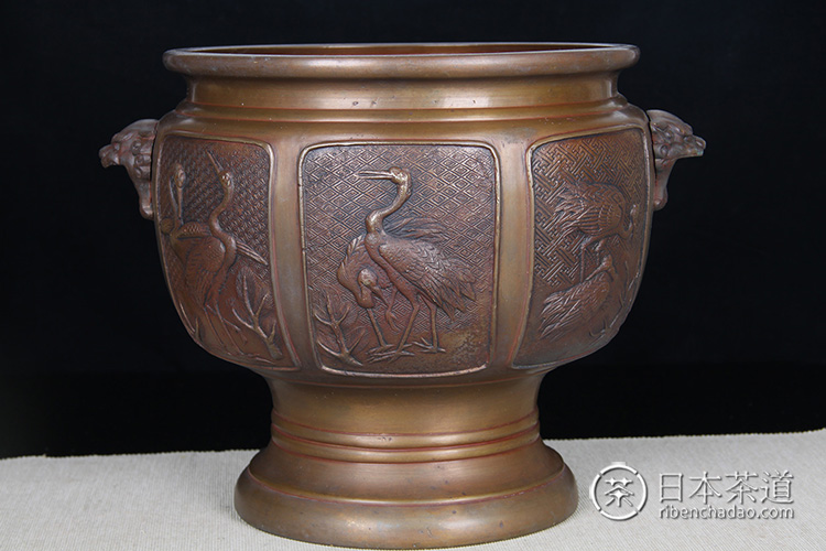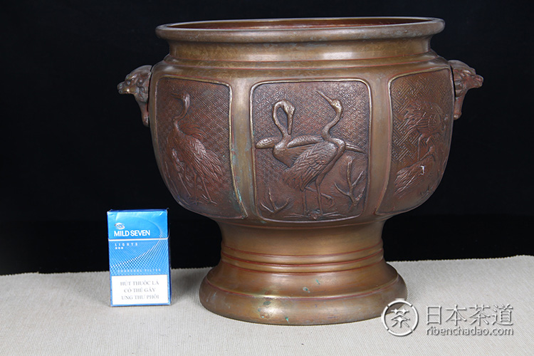 日本火钵 双兽耳 纪念款 六面开窗浮雕 精细鹤纹 宣德铜 老火钵 上手手感强 包浆足 非常厚重