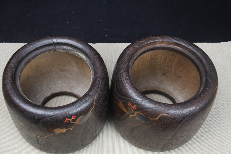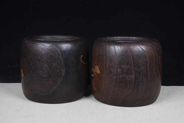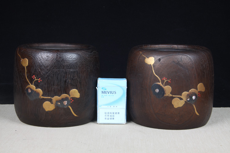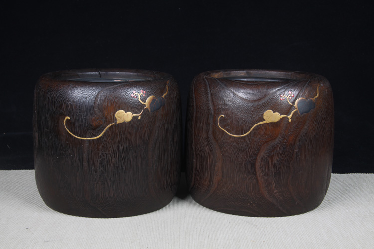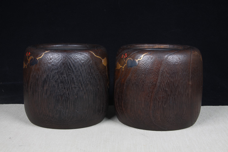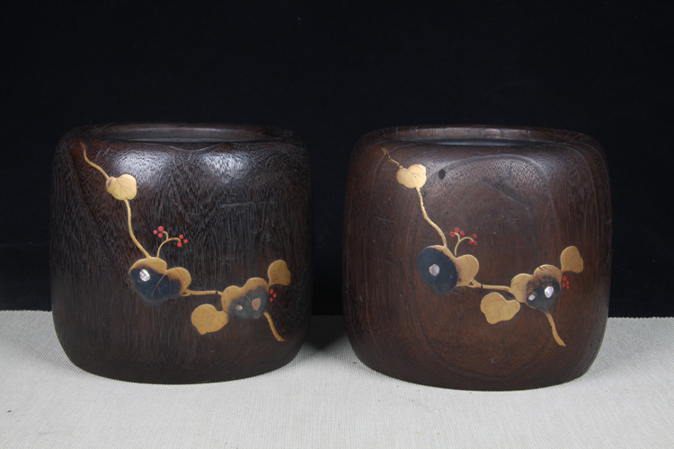 【名称】日本火钵 日本桐木小火钵一对 日本桐木火钵,漆绘花草纹,带螺钿工艺,内带铜胆,小火钵难得,一只有老裂。