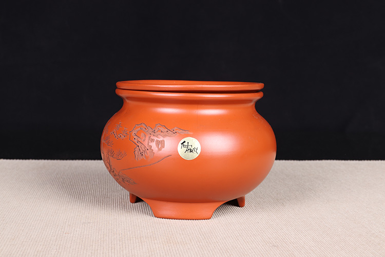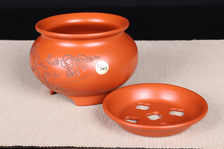 【名称】日本建水 日本常滑烧朱泥松针纹三足有盖建水 日本常滑烧工艺,手刻松针汉字纹,器型漂亮,工艺精细。