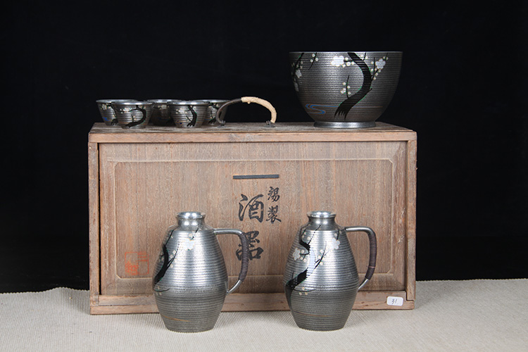 日本茶杯组 日本本锡锡半制品茶杯五客 昭和三十四年制纪念款,带原装供箱