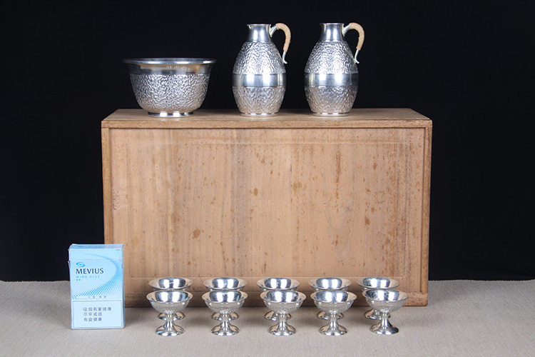 【名称】日本酒器 日本本锡酒壶建水品酒杯十三件 日本本锡底款锡制酒器酒具,岩肌纹,两酒壶,一只温酒器,十只品酒杯,整套酒具,带原装供箱。