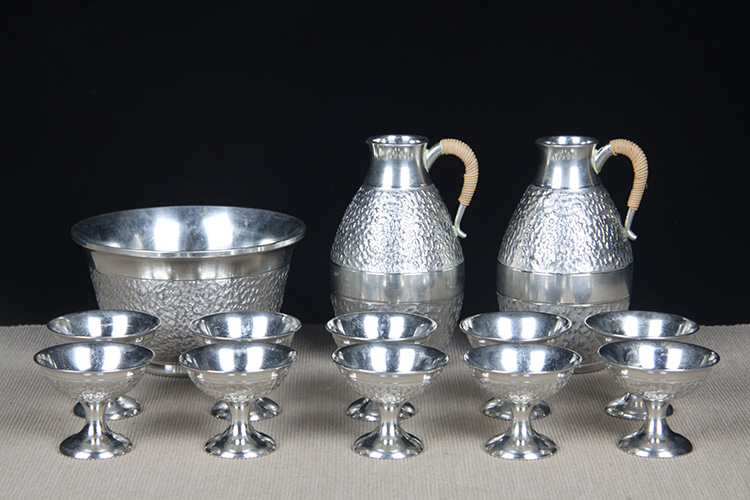 日本酒器 日本本锡酒壶建水品酒杯十三件 日本本锡底款锡制酒器酒具,岩肌纹,两酒壶,一只温酒器,十只品酒杯
