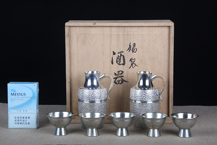 日本茶器 日本本锡螺旋纹酒壶品茶杯七件套 日本本锡款锡制酒具,酒壶均有凹陷,品茶杯完美,带原装供箱,特价出