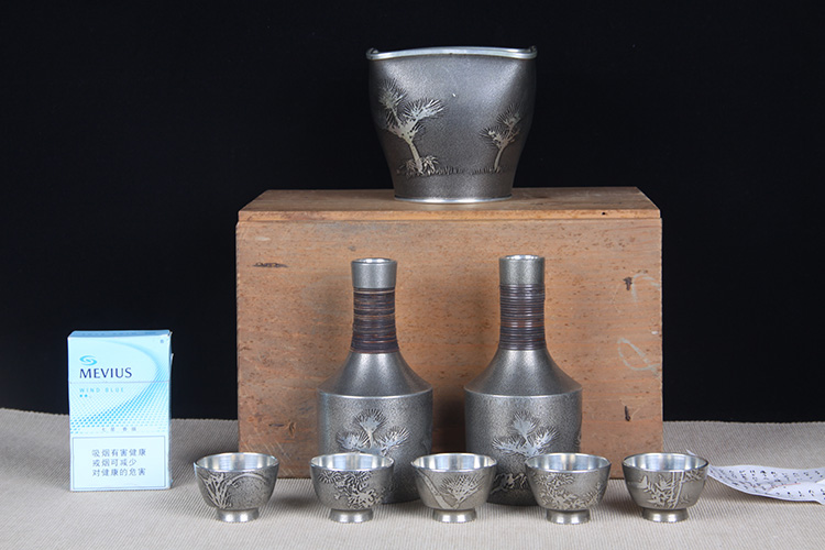 【名称】日本酒器 日本锡制酒壶温酒器品酒杯八件套 日本锡器,锡制酒器,精铸松竹梅三友图,包浆完美,酒壶,温酒器,酒杯底款均不同,带供箱。