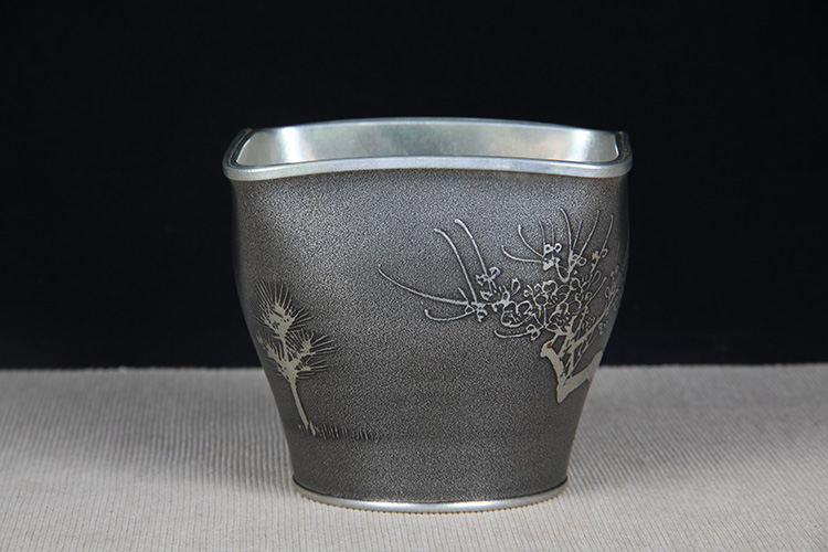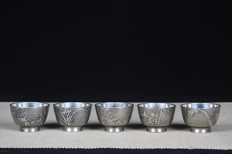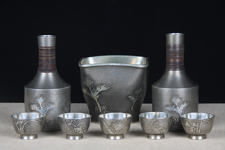 日本酒器 日本锡制酒壶温酒器品酒杯八件套 日本锡器,锡制酒器,精铸松竹梅三友图,包浆完美,酒壶,温酒器