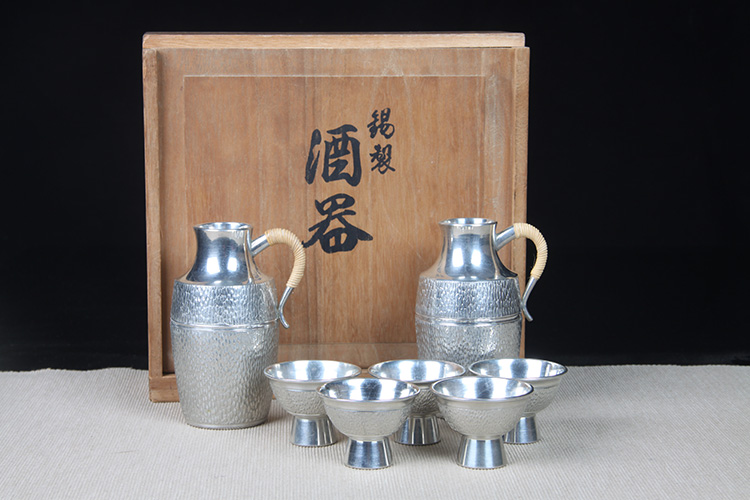 【名称】日本酒器 日本锡制酒壶高脚酒杯七件套 日本本锡锡半款锡制酒器一套,难得高脚酒杯,整体库存全新,带原装供箱,供箱有损。