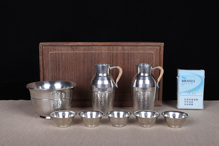 【名称】日本酒器 日本本锡锤目纹锡制酒器八件套 日本本锡款锡制酒器,锤目纹工艺精细,几乎全新,带原装供箱。