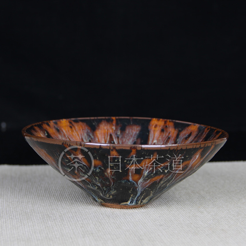 日本陶瓷 日本抹茶碗 铁胎铁釉铁斑斗笠型抹茶碗 利用铁斑烧制成花卉图案 釉水带开片 带原装供箱