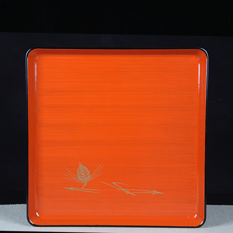 日本漆器 日本轮岛涂木胎漆器朱红大漆四方盘 内绘制朱红大漆,金漆绘制松果纹,底为黑漆,四方盘,做果盘干泡台都十分合适,带原装供箱。