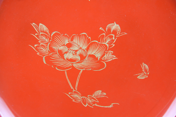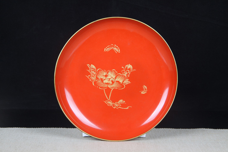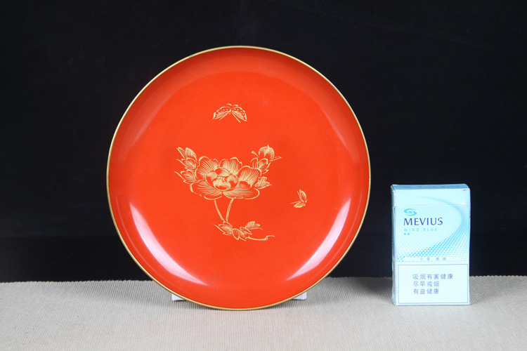 【名称】日本漆器日本轮岛涂木胎漆器 内朱红大漆,刻绘花卉蝴蝶纹,涂金,刻绘栩栩如生,功力深厚,黑漆底,盘口描金,性价比高。口:19.5cm,底:16cm,高:2.5cm,重量:121.3g。