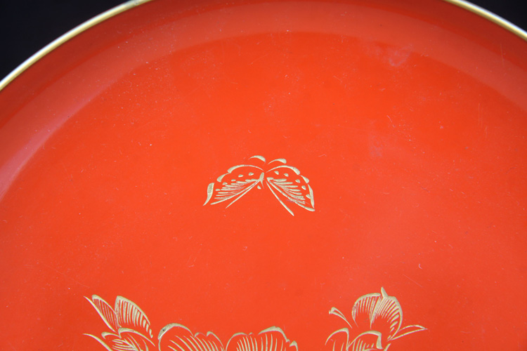 日本漆器 日本轮岛涂木胎漆器 ​内朱红大漆,刻绘花卉蝴蝶纹,涂金,刻绘栩栩如生,功力深厚,黑漆底,盘口描金,性价比高