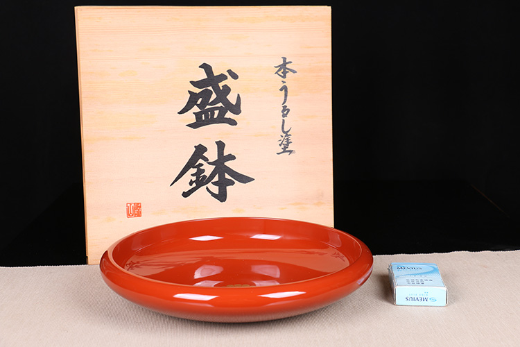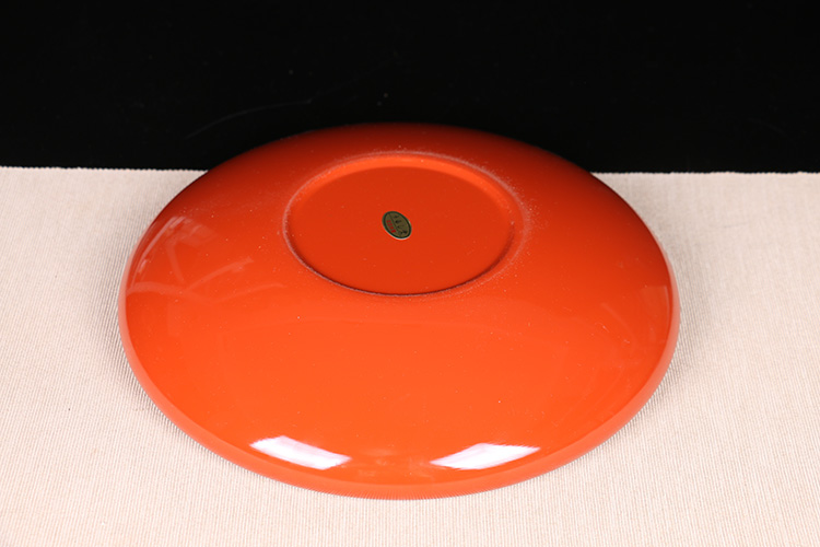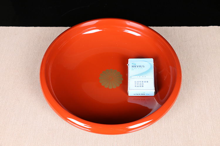【名称】日本漆器 日本轮岛涂木胎漆器大果子盘 日本轮岛涂工艺,整体朱红大漆,内皇室菊花纹,整体较大,做干泡台十分合适,带原装供箱。
