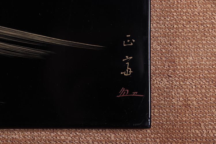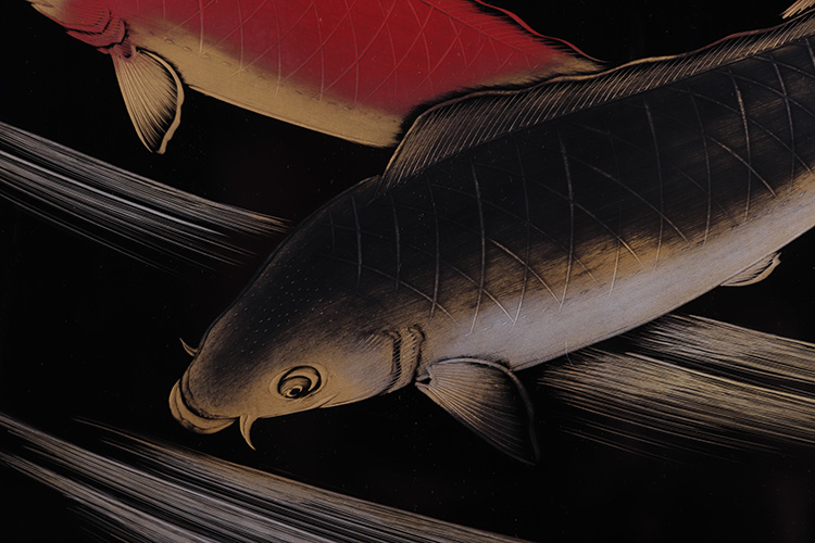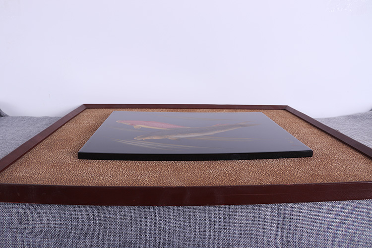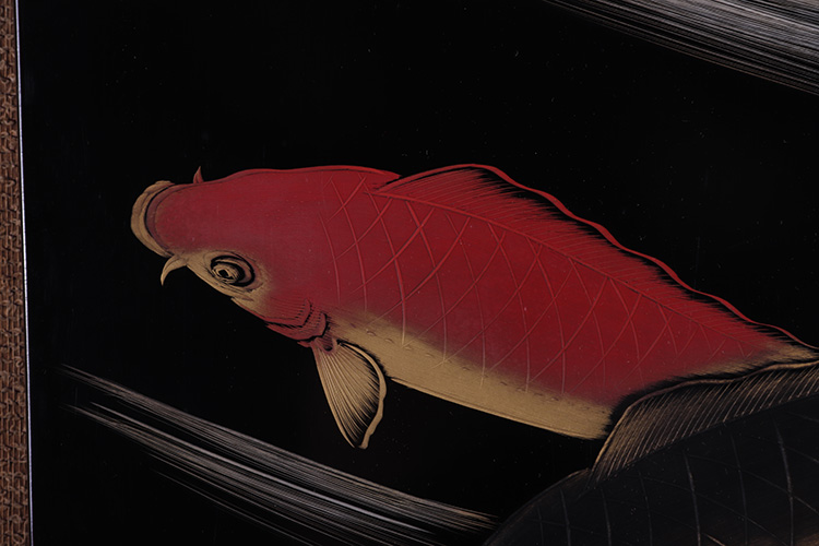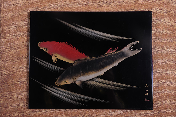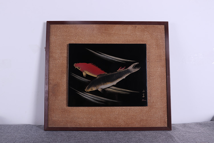【名称】日本漆器 日本轮岛涂木胎漆器漆绘鲤鱼纹挂画 日本漆器工艺,雕刻绘制鲤鱼纹,工艺精细,颜色漂亮,带作者款识。