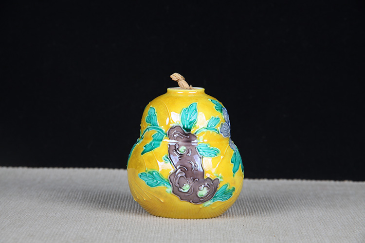 【名称】日本陶瓷 日本黄釉雕刻花卉山水纹茶入盖置两客 日本黄釉工艺,釉水肥润,雕刻山石花卉纹,工艺精细,做工精美,一只茶叶罐,一只盖置。