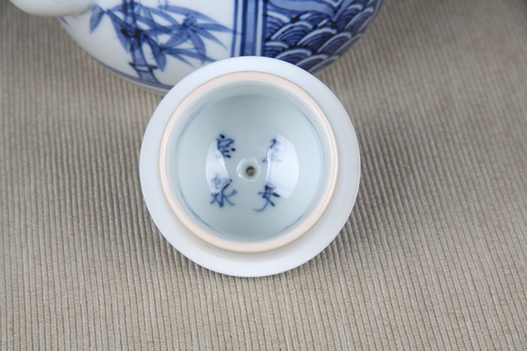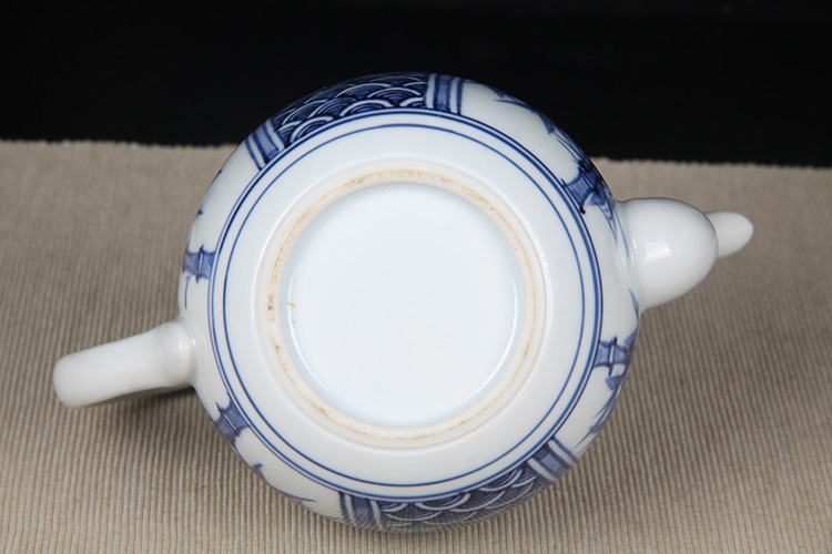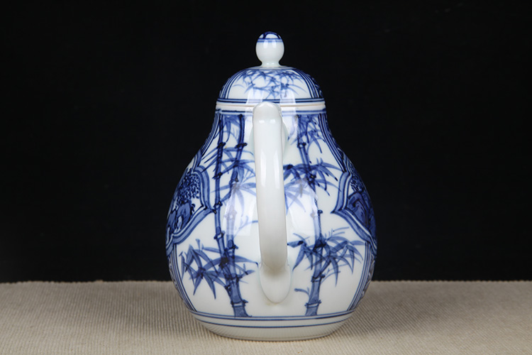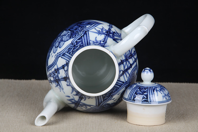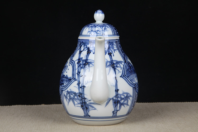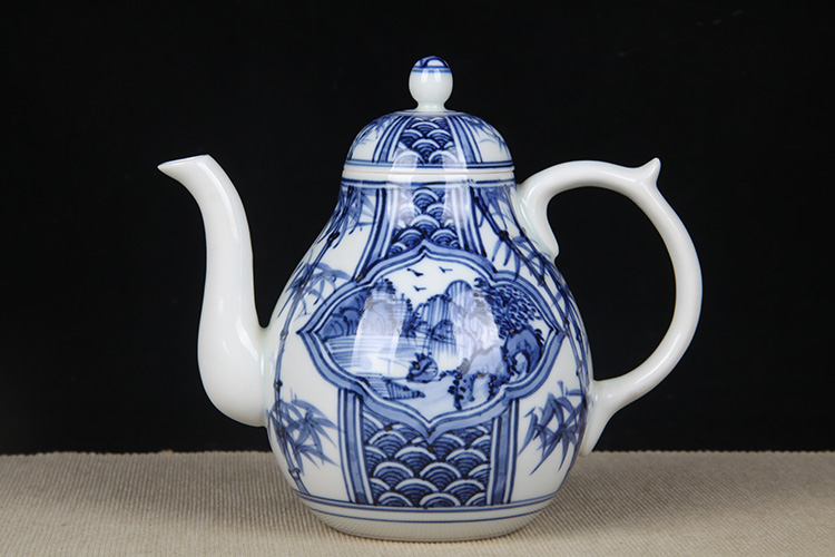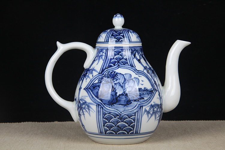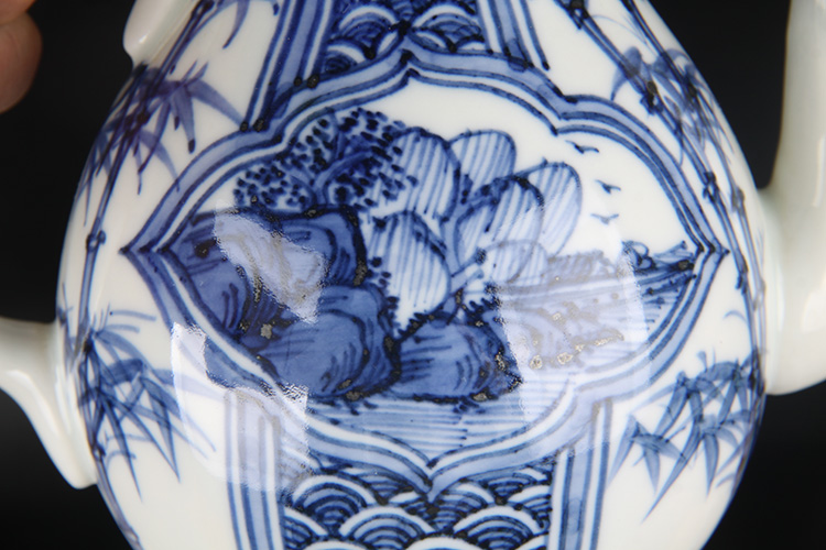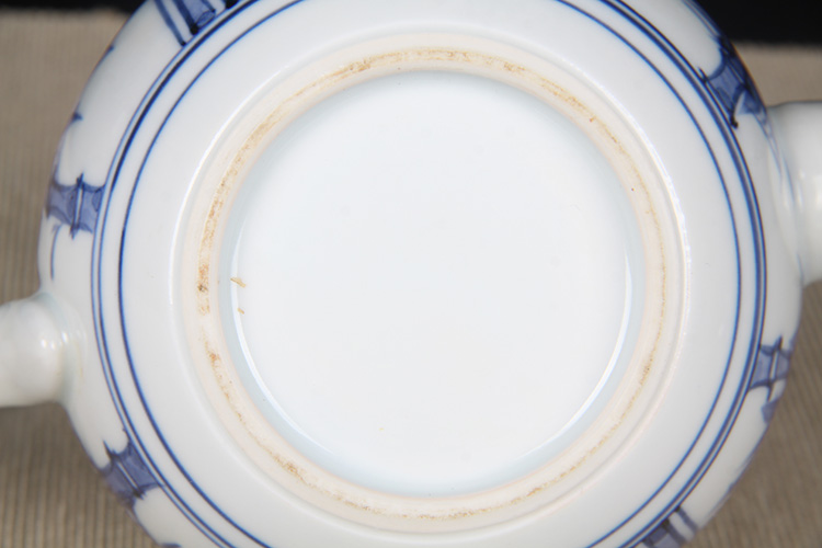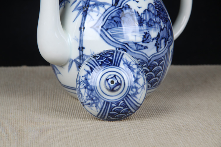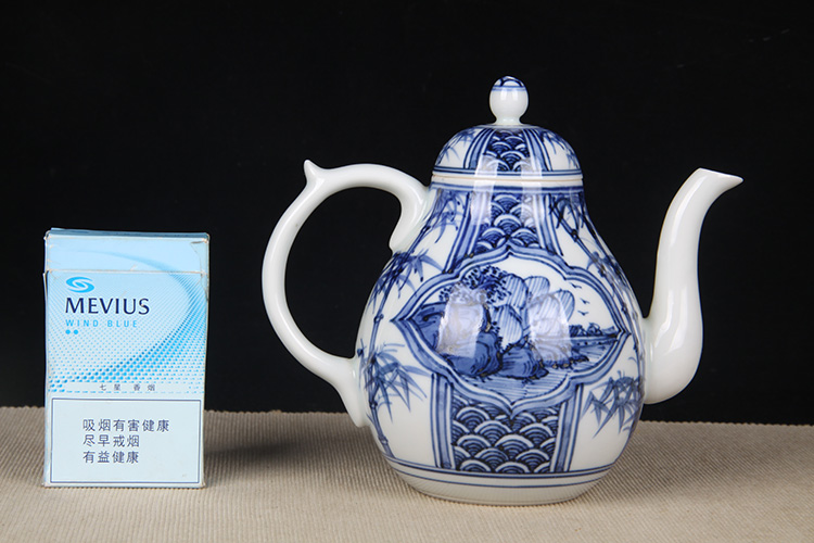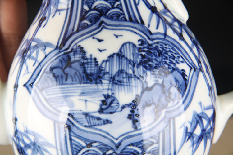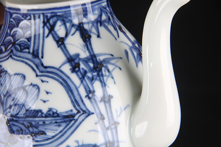 日本陶瓷急须 日本青花开窗山水竹叶纹瓷壶 日本青花工艺,明代画工,采用苏麻离青,发色沉稳,釉水肥润
