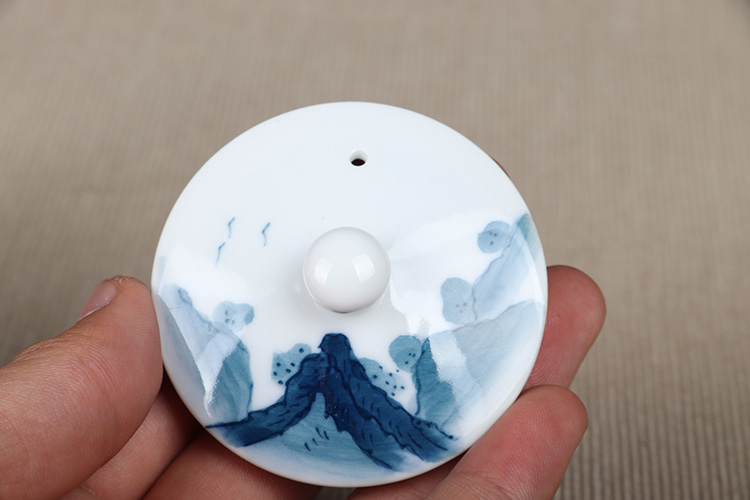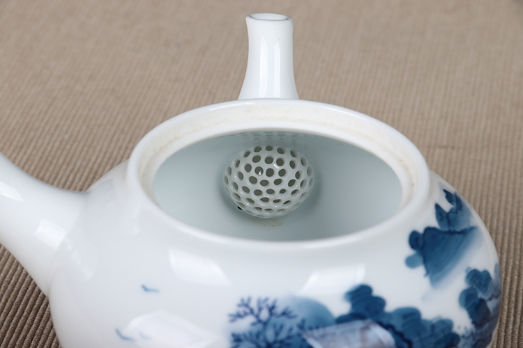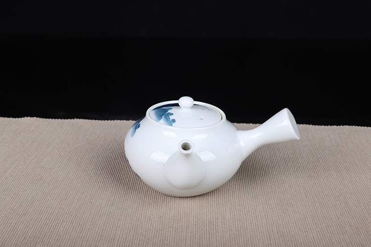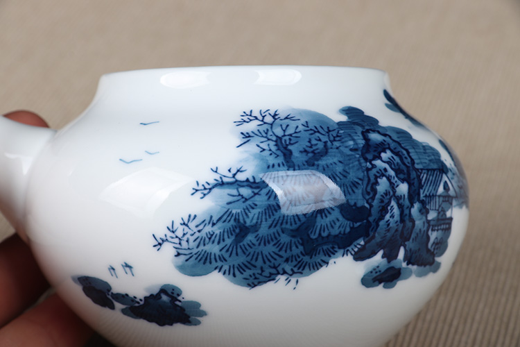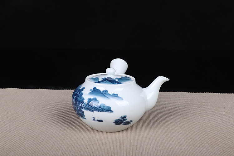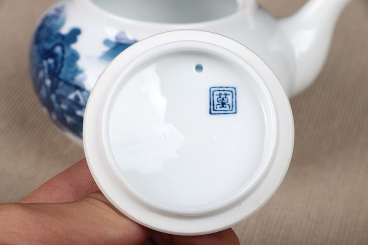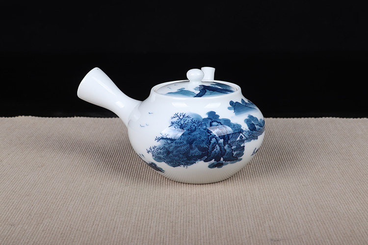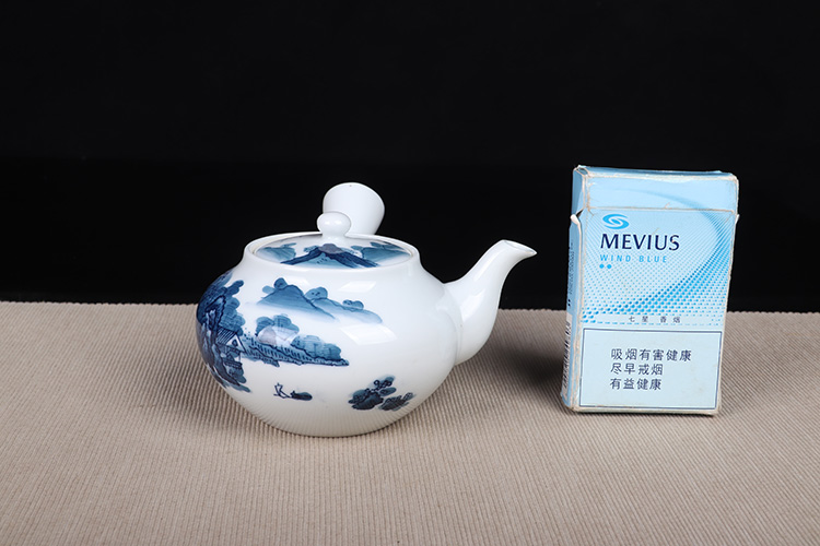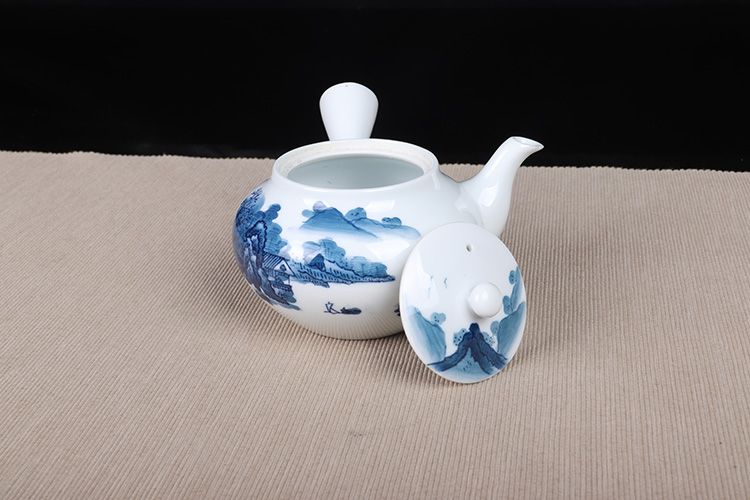日本陶瓷急须 日本青花开窗山水纹茶壶急须 日本青花工艺,采用苏麻离青,发色湛蓝,釉水肥润,绘制开窗山水