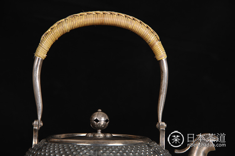 日本银壶 纯银制 银川堂造 经典霰纹 瑞兽嘴 竹编把防烫 老银壶 器型饱满 收藏使用皆宜