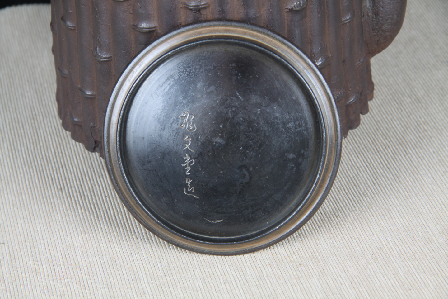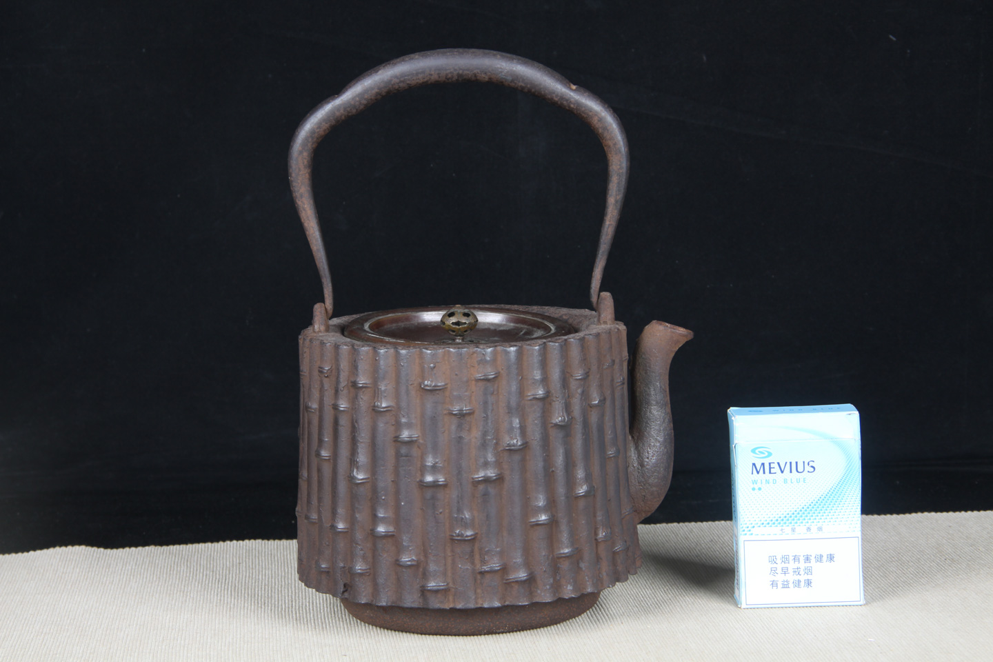 【名称】日本铁壶日本京都系关西铁瓶龙文堂竹节型老铁壶紫斑铜盖,厚重,做工精细,铸造竹节型,难得年份老的京都系关西铁瓶。口:10.5cm,底:11.5cm,高:13.1cm,全高:26cm,肚:15.4cm,重量:2757.5g,容量:1753ml。